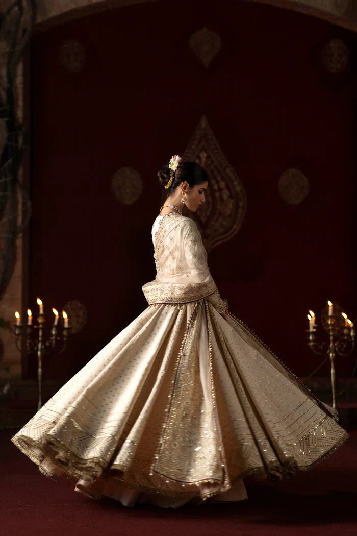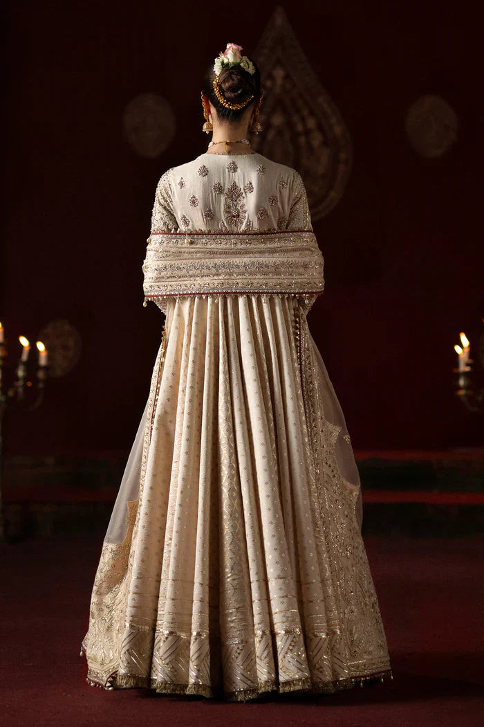 A timeless flairy pishwas in a soft pinkish white hue, adorned with delicate handwork on the bodice that adds regal charm. Paired with an intricately embellished organza dupatta, this ensemble flows with grace and sophistication — perfect for an ethereal bridal or festive statement.