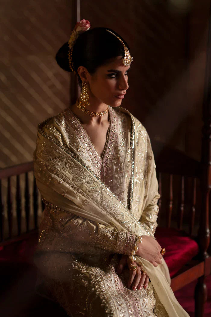 A stunning long pastel olive shirt on luxe tassel silk, adorned with delicate embroidery and intricate handwork. The design is elevated with elegant color-blocking side details, making it truly eye-catching. Paired with a beautifully embroidered dupatta and finely crafted hand-worked sharara pants, this ensemble blends grace with timeless artistry.