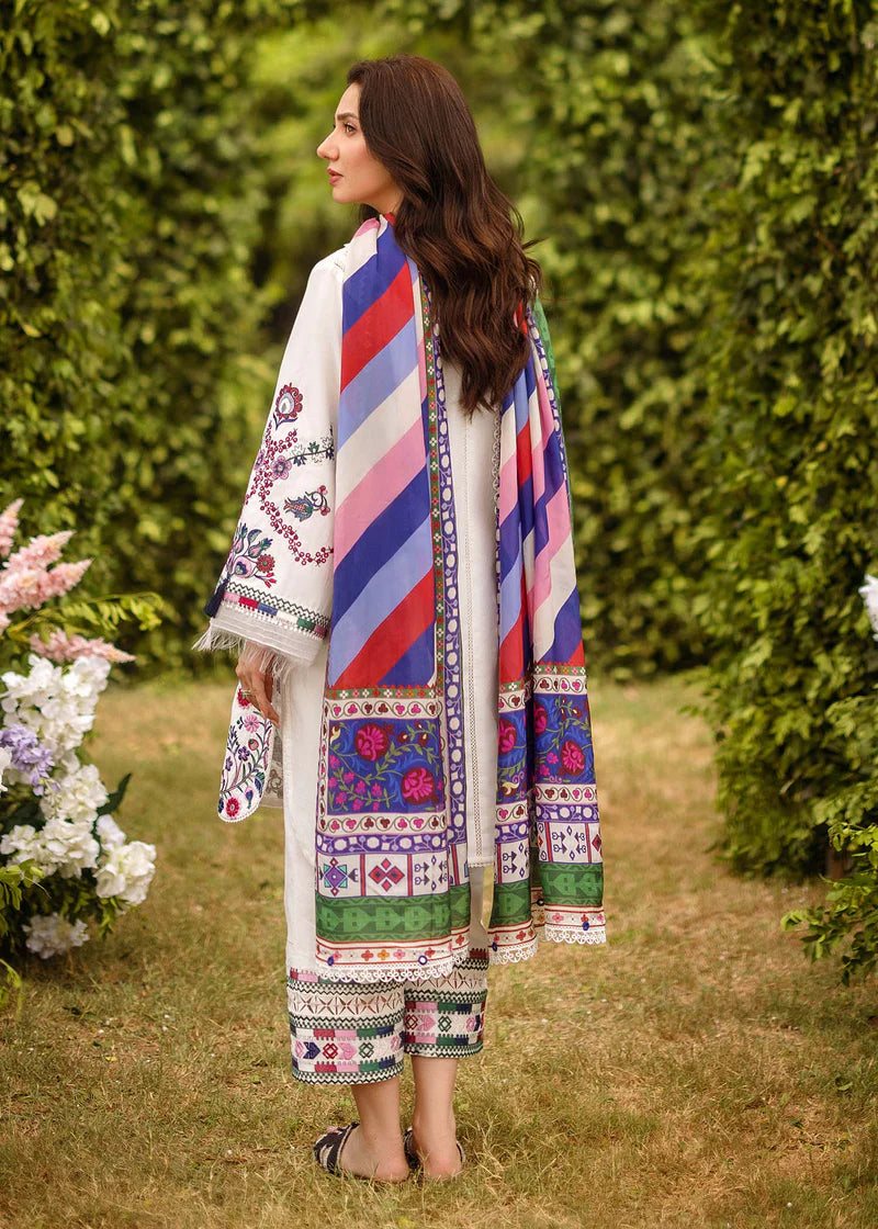 Embroidered lawn Front Panel (Center)-1 piece Embroidered lawn Side Panel (Right)-1 piece Embroidered lawn Side Panel (Left)-1 piece Embroidered lawn Sleeves-0.66 meter Embroidered organza Shirt border-2 meter Embroidered organza trouser border-2 meter Embroidered organza Neckline patch-1 piece Lawn Back-1 meter Digital silk Dupatta-2.66 meter Cambric Trouser-2 meter “Suzani – An ode to tribal textile decorations. Multi colored floral vines climb up a softly enhanced and enriched base of summer lawn. Offset with Aztec embroidery borders and a digital printed beautiful striped silk dupatta.” Disclaimer: This is an unstitched article. Stitching facility is not provided. Tassels, laces and buttons are not included in the article. Product color may slightly vary due to photographic lighting sources or your monitor setting.