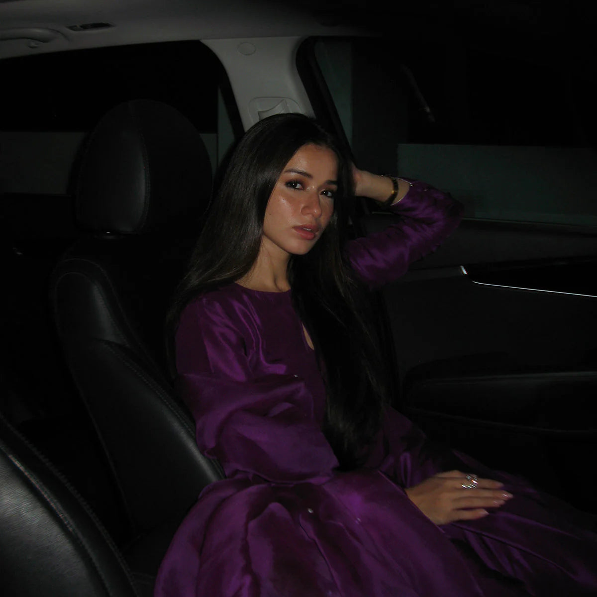 This rich purple ensemble features a cropped raw silk shirt paired with an exaggerated Farshi Shalwar, cut with commanding volume and floor-sweeping drama. The Farshi is tailored with deep inner pleats that begin high at the waist, A matching organza dupatta rests over the shoulders, offering light structure.