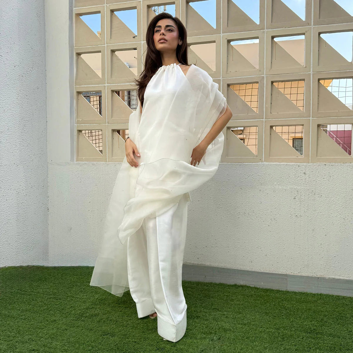 A white outfit that balances structure and volume. The halter-style neckline brings definition to the upper frame, while the farshi shalwar adds movement and tradition. The organza dupatta is styled to frame the look not float.