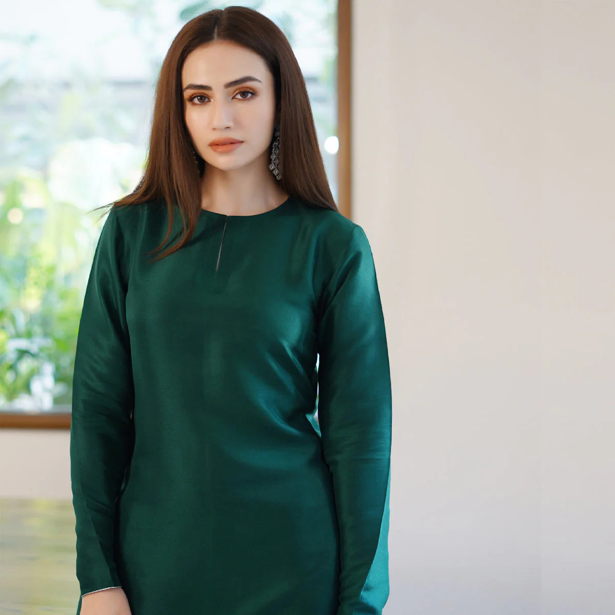 This bottle green raw silk outfit features a chic short shirt and flowing farshi shalwar, blending tradition with modern flair. The rich texture of pure raw silk adds depth and structure, while the plain organza dupatta brings a soft, graceful finish. An effortlessly elegant choice for festive occasions and cultural celebrations.