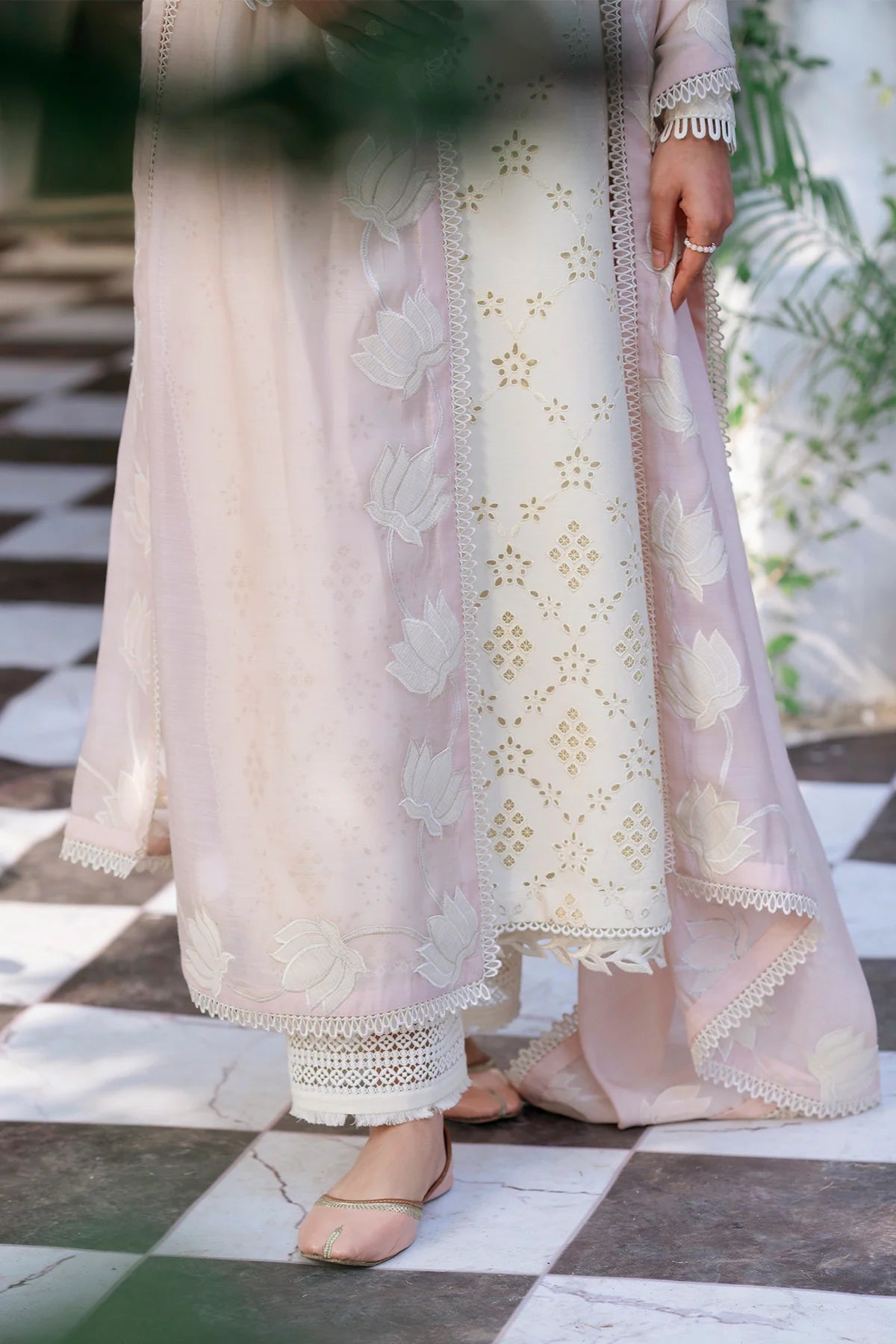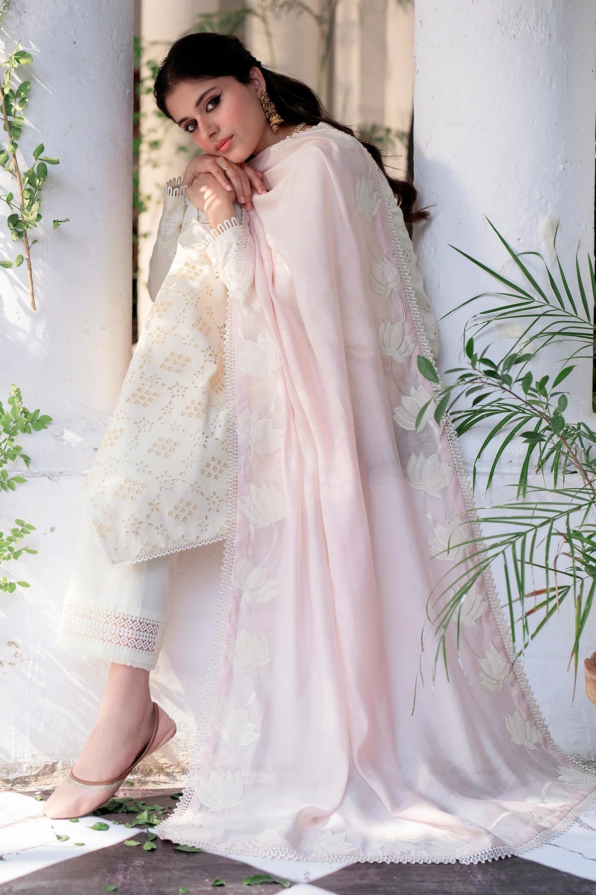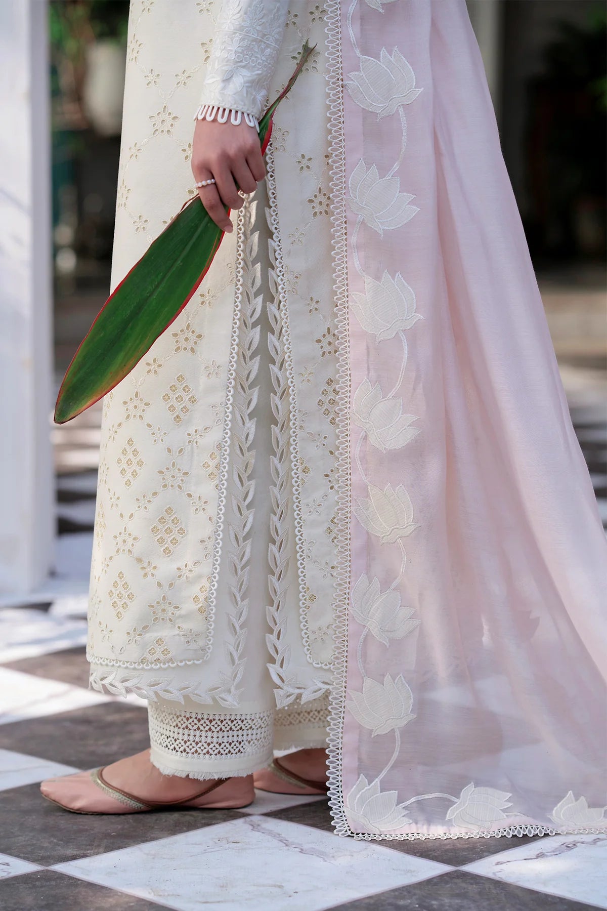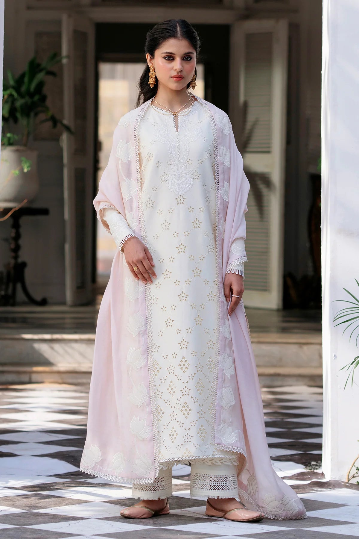 A beige kurta adorned with intricateemy and delicate schiffli, paired with lace-detailed culottes for an elegant touch. A soft pink embroidered dupatta adds a hint of grace, completing this timeless look.