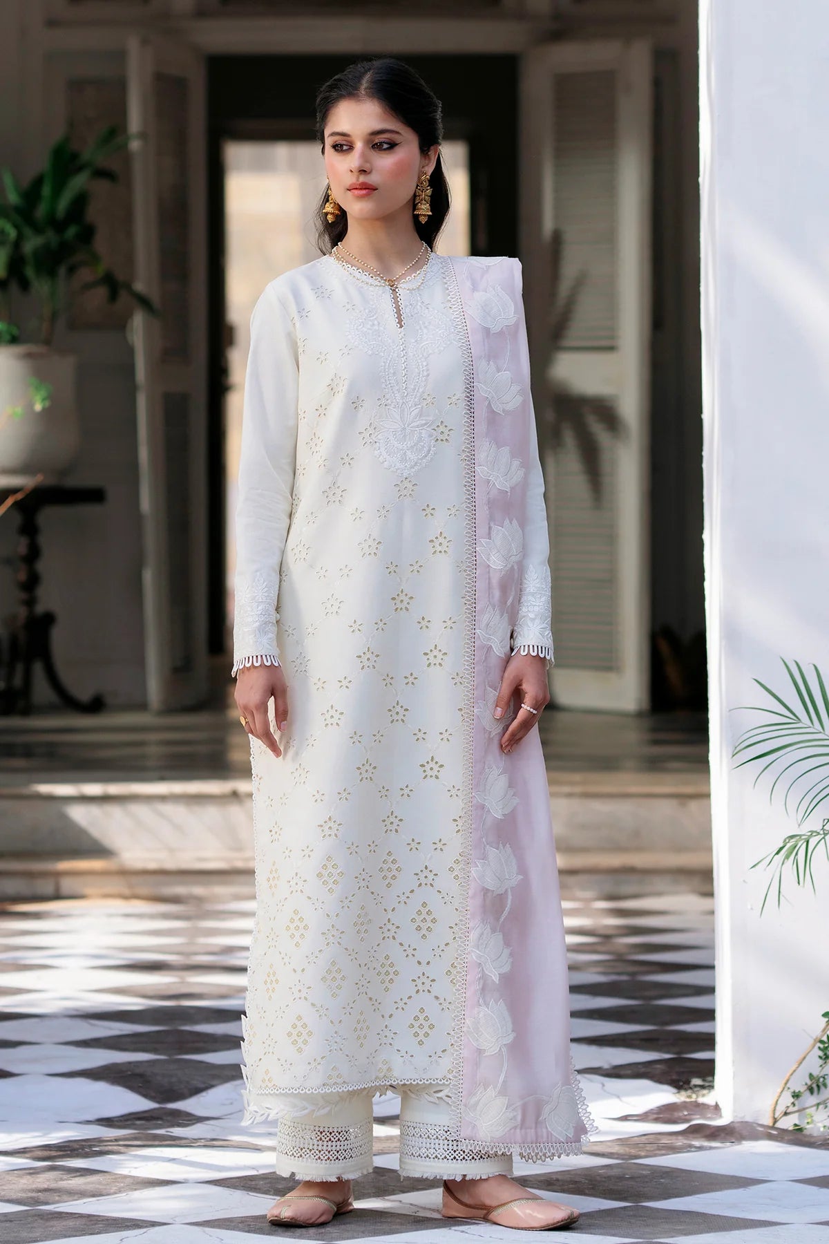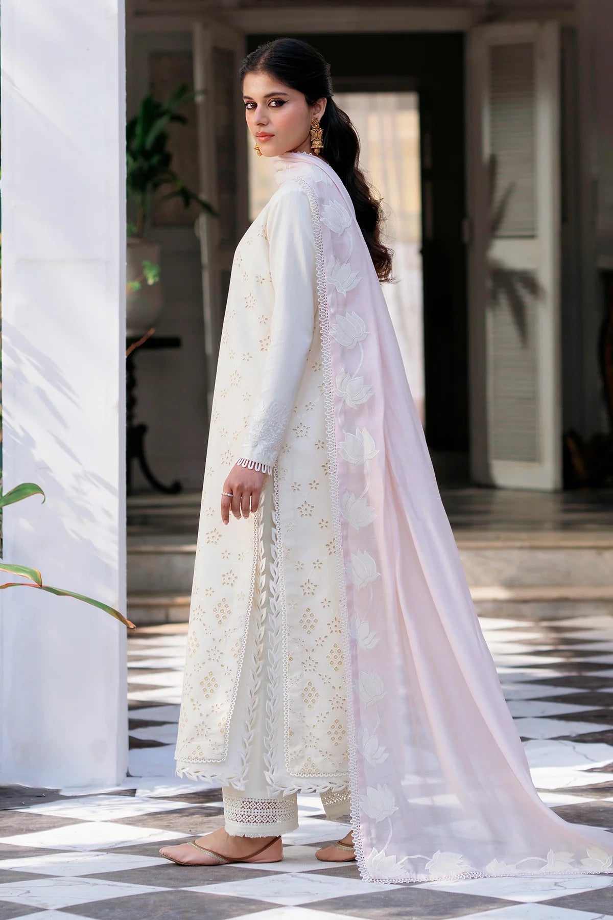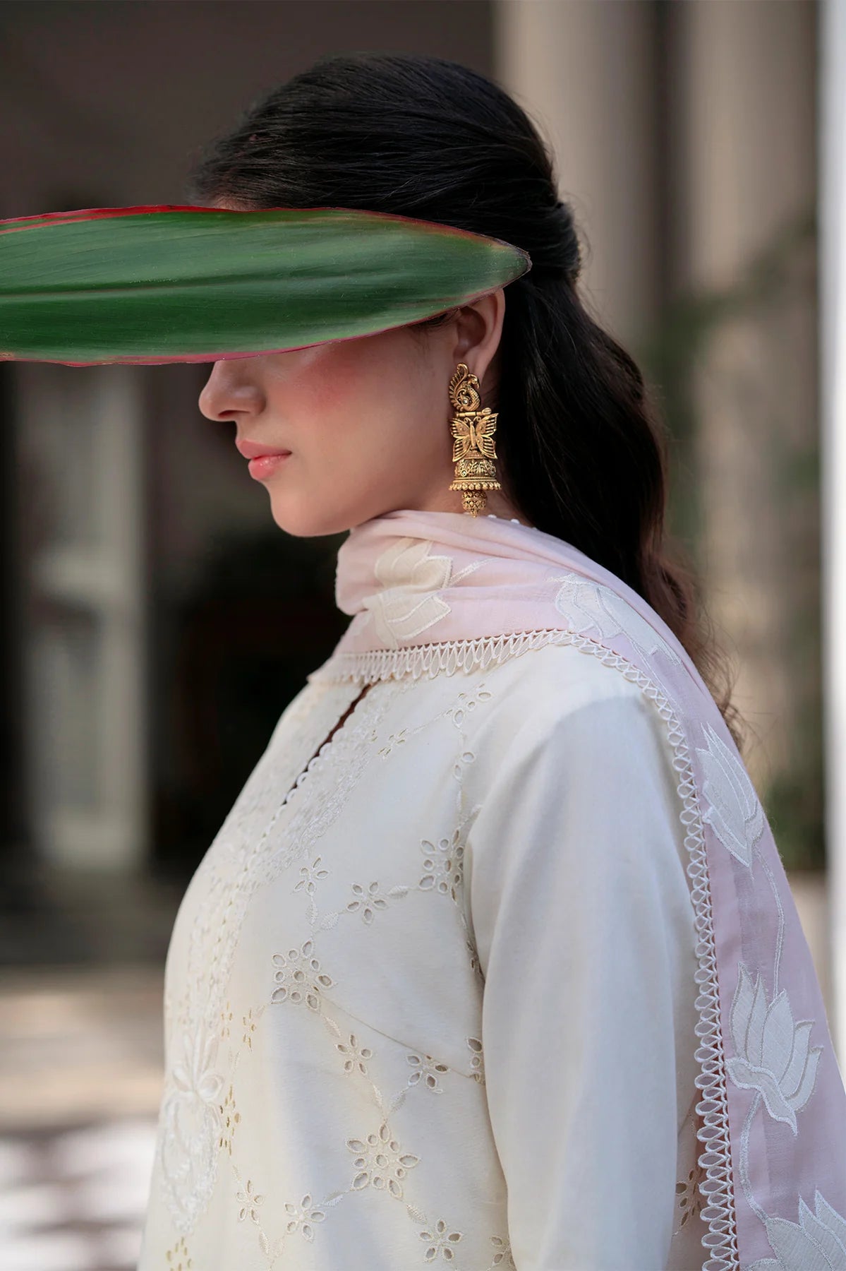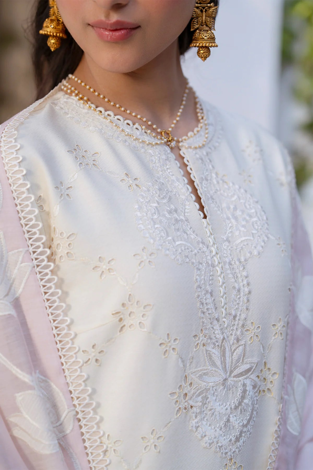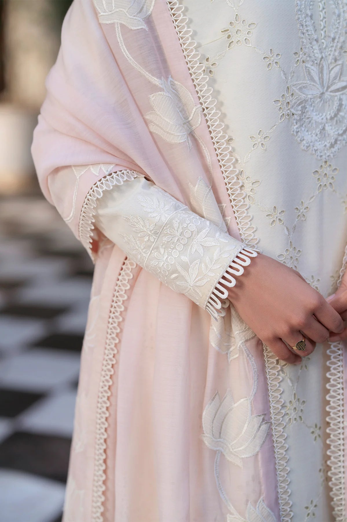 A beige kurta adorned with intricateemy and delicate schiffli, paired with lace-detailed culottes for an elegant touch. A soft pink embroidered dupatta adds a hint of grace, completing this timeless look.
