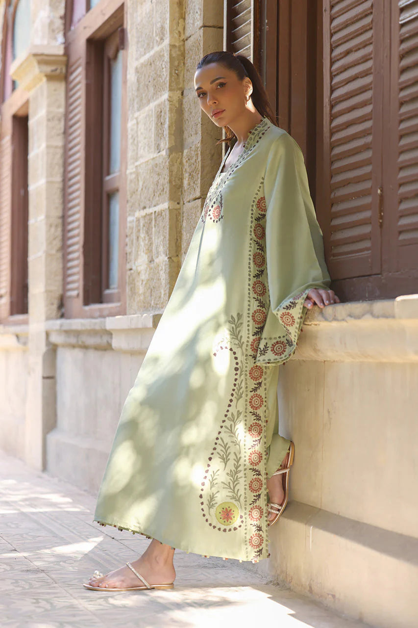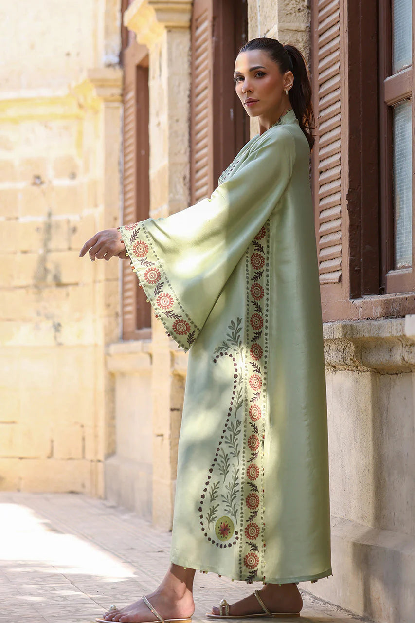A soft sage green pure rawsilk shirt is adorned with delicate earthy toned embroidery highlighting the neckline, slits, and exaggerated bell sleeves. This graceful ensemble captures a timeless charm and pairs seamlessly with a matching pure rawsilk tube top and trousers for a refined look.