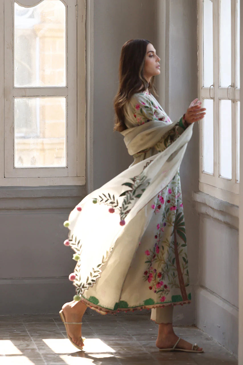 The epitome of effortless grace, a khaddi corduroy shirt in the lightest hue of celadon is intricately embroidered with vibrant botanical and palm motifs. The relaxed silhouette is complemented with matching pure rawsilk scalloped trousers. Paired with a cascading organza dupatta featuring botanical sprigs embroidered on the scalloped borders and playful pompom accents.