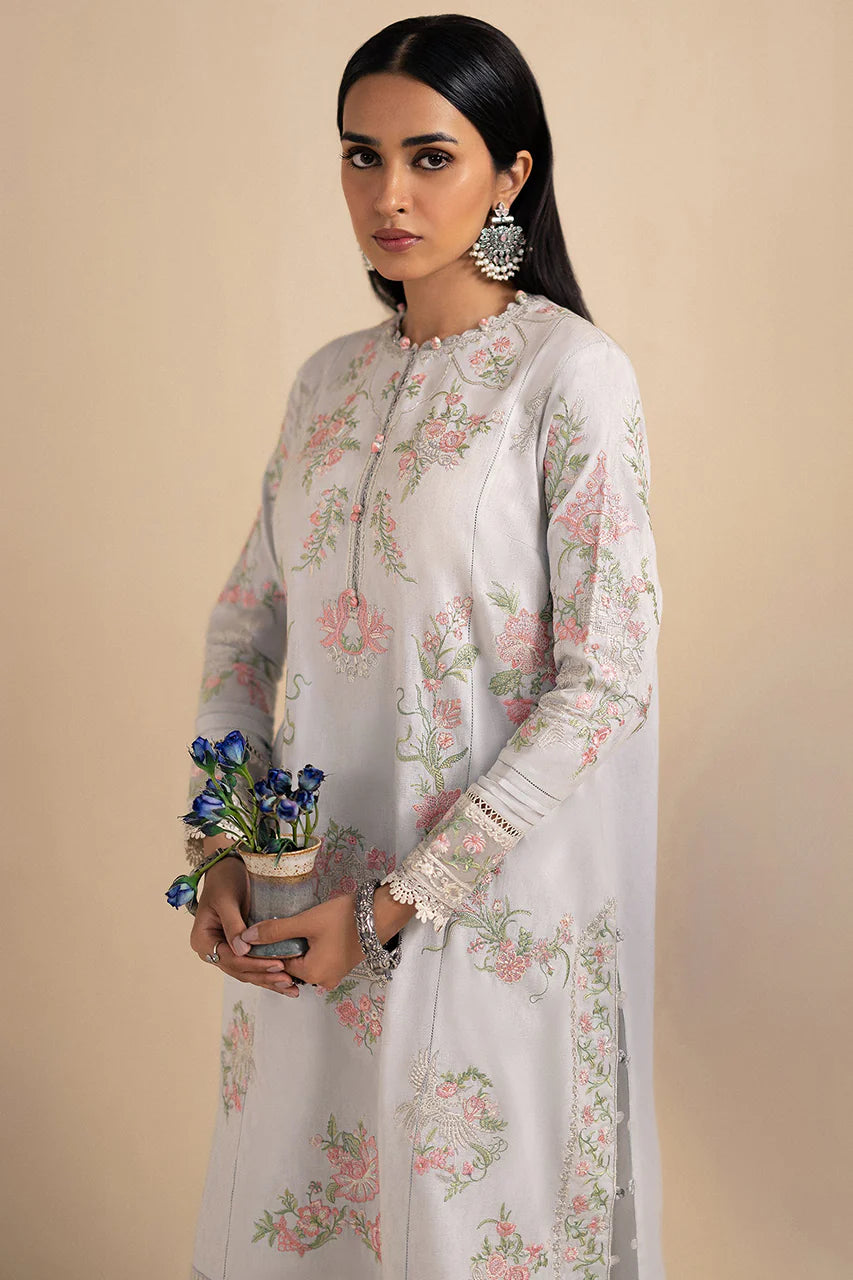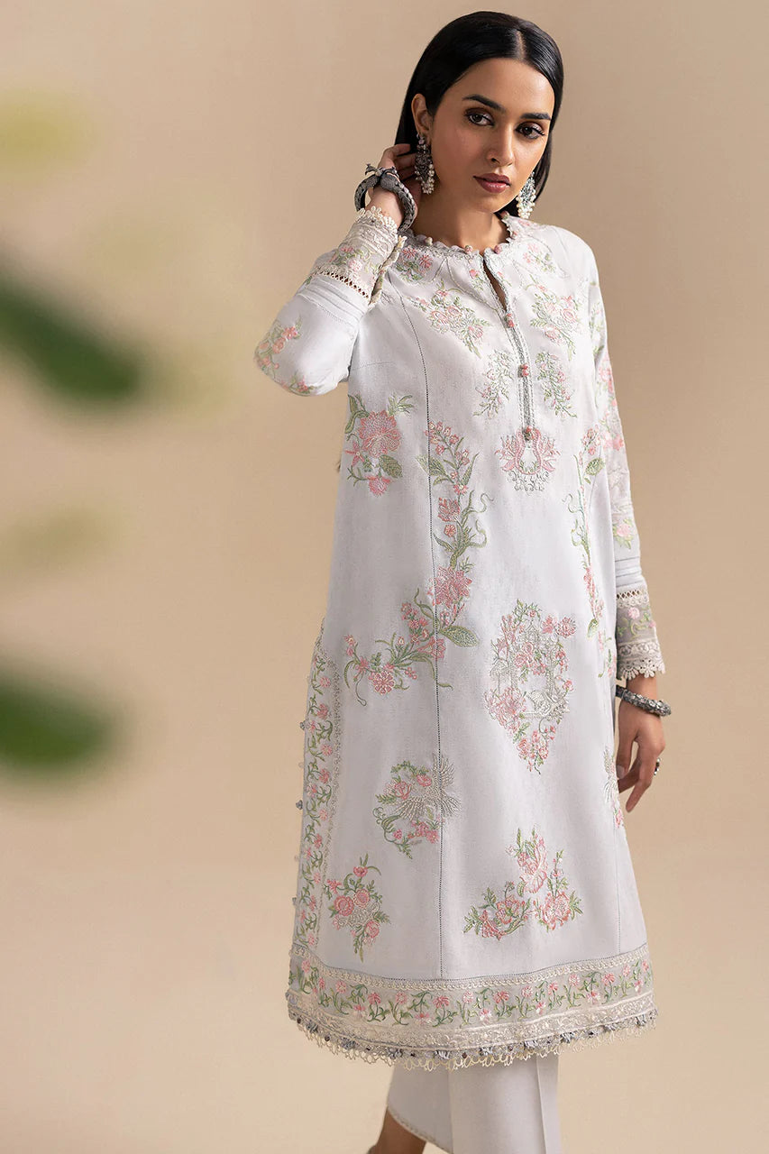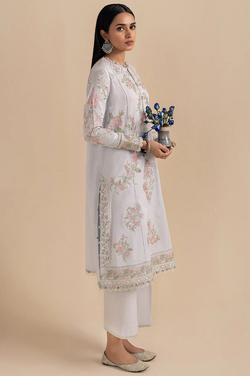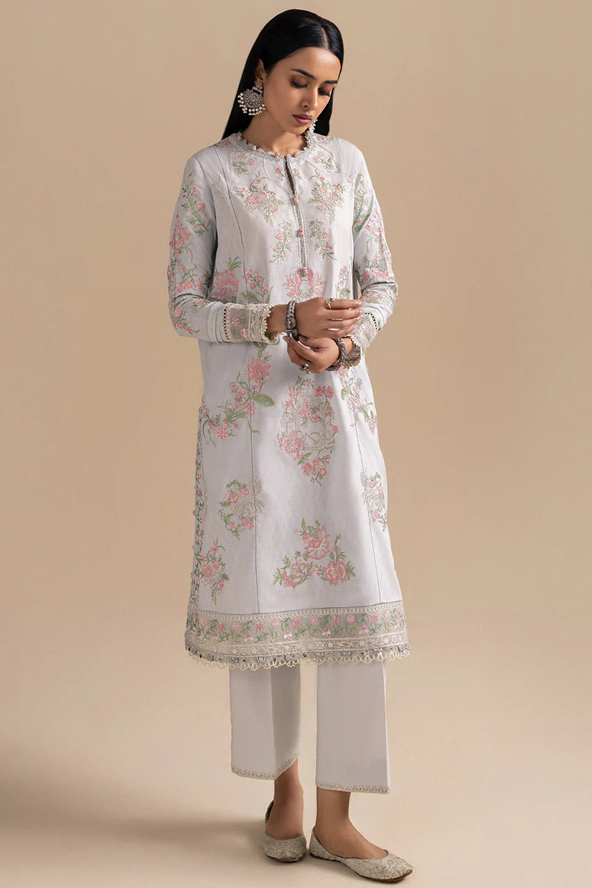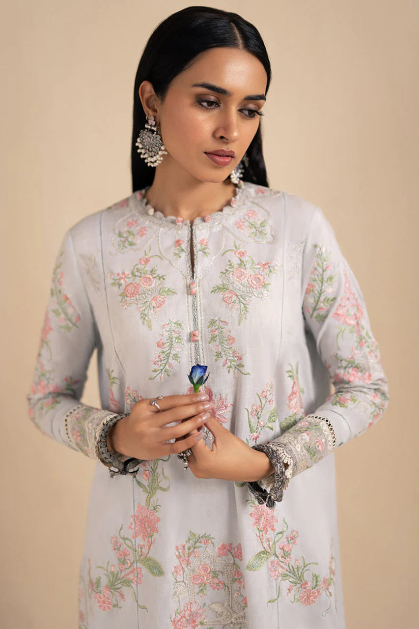 Introducing ‘Sarbi,’ an enchanting ensemble that beautifully embodies the essence of fall. A dreamy floral composition is intricately etched onto a serene sky canvas, capturing the tranquility of autumn skies. Rich accents of coral and sage breathe life into the fabric, transforming it into a stunning embroidered garden filled with the vibrant hues of the season. Each petal is a testament to exquisite artistry, celebrating the warm, inviting spirit of fall and the beauty of nature’s transition. ‘Sarbi’ invites you to embrace the elegance of autumn in all its untamed glory.