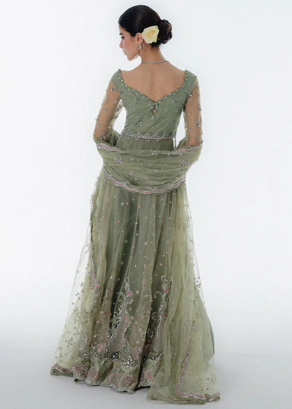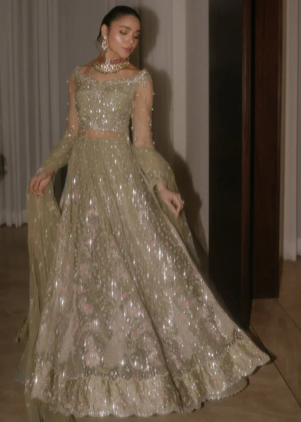 A gorgeous mint green peshwas accented with pink florets and a graciously worked canvas of panels on net base. Hand adorned with glistening crystals , pearls and hand crafted petals to bring the florals to life . This stylish floor length peshwas is paired with a net dupatta with scalloped borders running on all four sides and a glamourous spray of sequin based clusters all over to add oomph and endless shine.