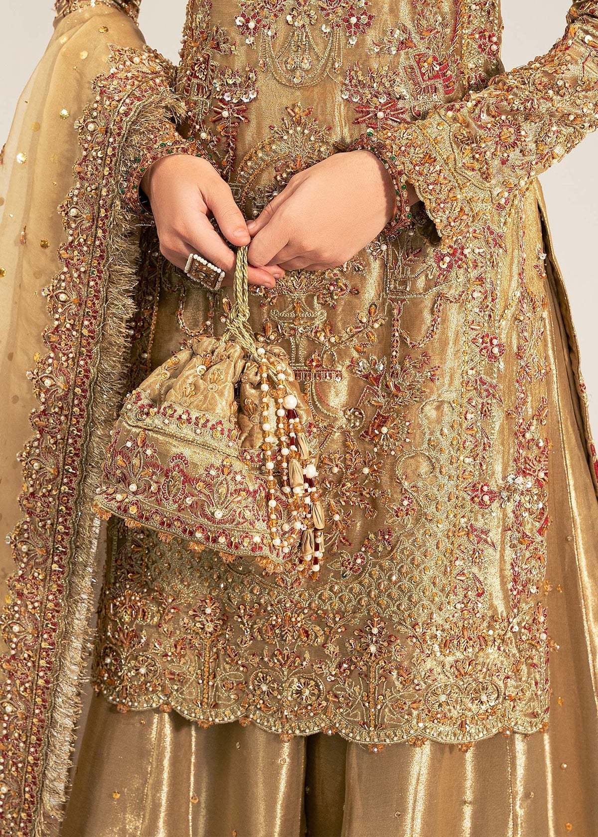 This luxurious gold ensemble features a shirt, gharara, and dupatta, all crafted from exquisite tissue fabric. The farshi tissue gharara is paired with a stunning Kathan organza mukesh dupatta, adding a touch of sophistication and grace. The outfit is adorned with intricate patterns of shimmering pearls and sequins, creating a captivating and mesmerizing effect. The combination of delicate embellishments and rich textures ensures this ensemble stands out as an epitome of elegance, perfect for making a dazzling impression at any special event.
