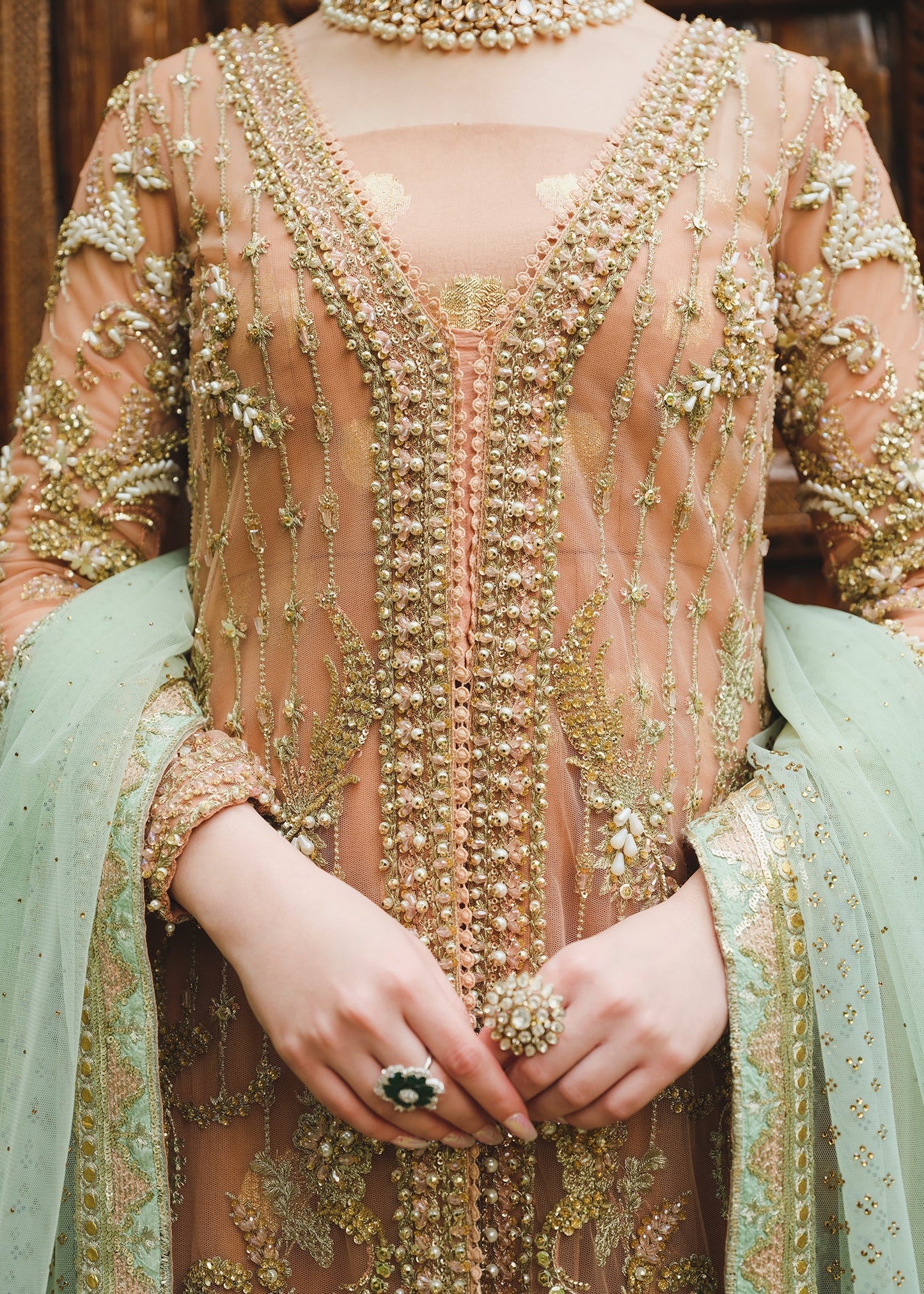 The prettiest peach outfit they ever was - the entire front is embellished in 3D crystals, pearls, Gota Patti and sequins. The front panels are finished with delicate tilla borders, and heavily embellished. This is the perfect showstopper ! The duppatta is a contrast mint tulle with scattered Swarovski crystals shining beautifully with appliqué corners on the Pallus in peach. The dress a jamawar organza finished with a pretty lace border in gold tilla.