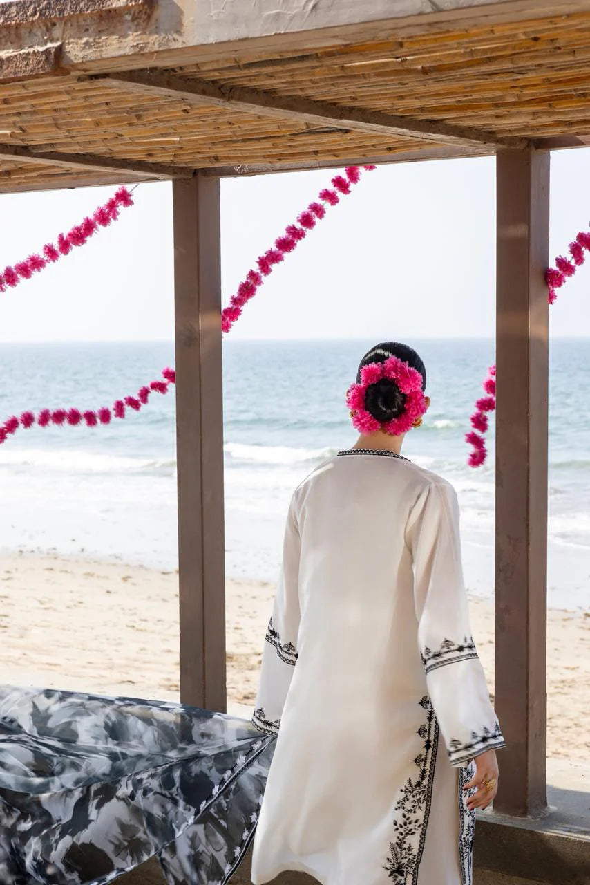 Where modern minimalism meets traditional charm, elevate your wardrobe this season with this chic ensemble. The straight cut kameez is decorated with feminine embroidery along the neckline, chaak and sleeves, featuring a double border with our signature tassel. The matching izaar is sleek and straight, finished with intricate embroidery on the hem. The set is completed with a dupatta featuring a black and white marble print and embroidered borders, tying the look together gracefully.