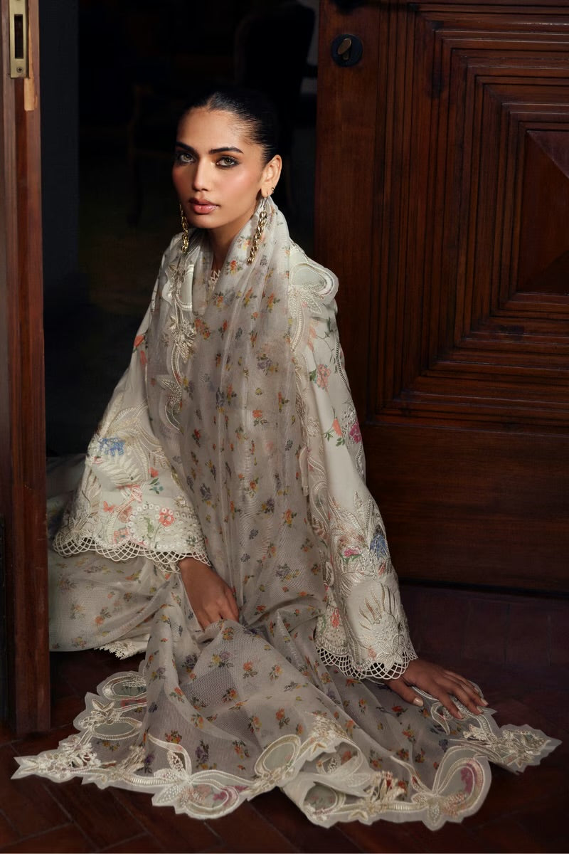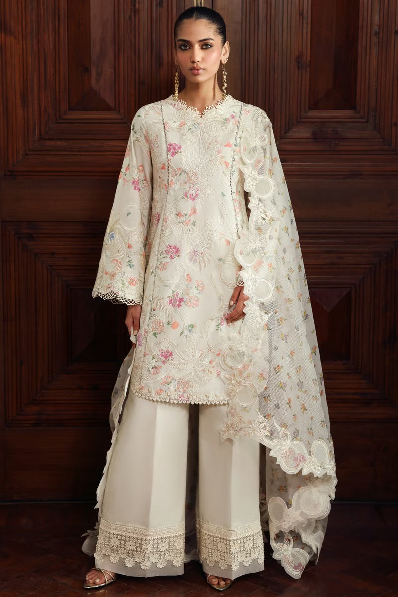 Designed in a cloud white base with delicate multi-tone florals, this piece feels fresh, light, and effortless. The short shirt is finished with detailed embroidery along the hem, paired with straight azar pants for a clean silhouette, and a printed cotton net dupatta that adds just the right touch of color.