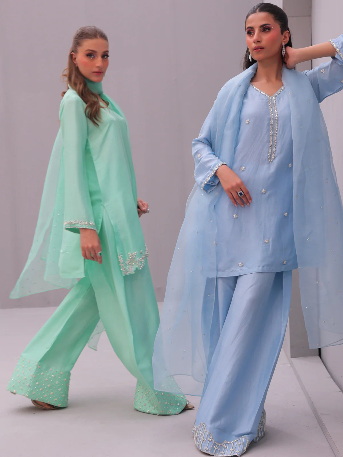This stunning mint green outfit exudes fresh, modern elegance with a blend of intricate handwork and contemporary design, making it the perfect choice for festive occasions. The ensemble features a short, embellished shirt that is artfully detailed with a mix of gorgeous pearls, multi-colored stones, sparkling diamantes, and exquisite French stone accents. These embellishments adorn the hem and sleeves of the shirt, creating a dazzling, eye-catching effect that captures light and attention from every angle.