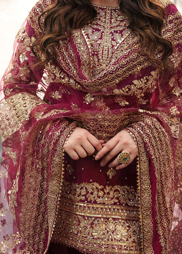 A dream woven in threads of tradition and adorned with the poetry of heritage. Drenched in a regal rose hue, this handcrafted ensemble is a tribute to every woman who carries stories in her silence and royalty in her grace. The intricate gold embroidery blooms like forgotten verses across the fabric, while the rich dupatta cascades like a prayer whispered under ancestral arches. Tabeer is not just an outfit, it is a vision brought to life, where every detail speaks of love, legacy, and light. 🌸