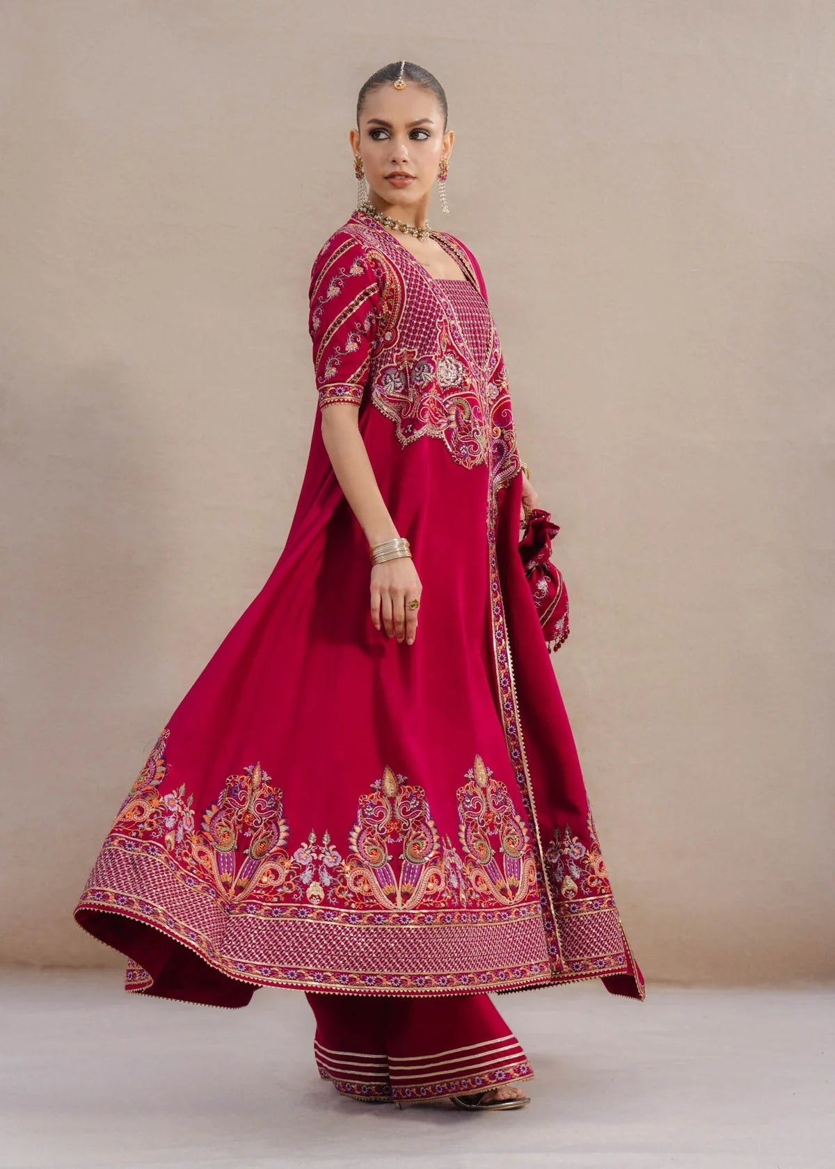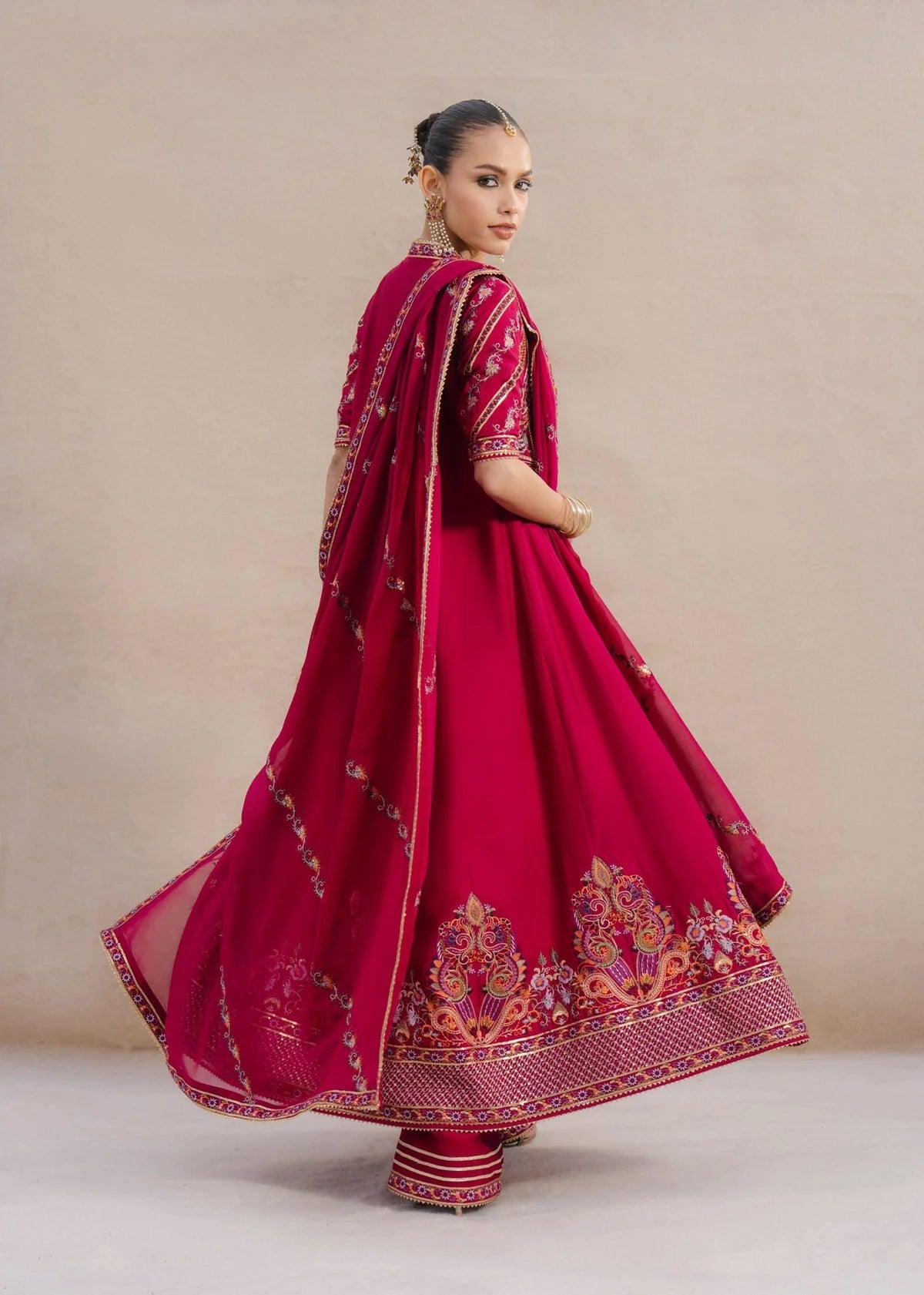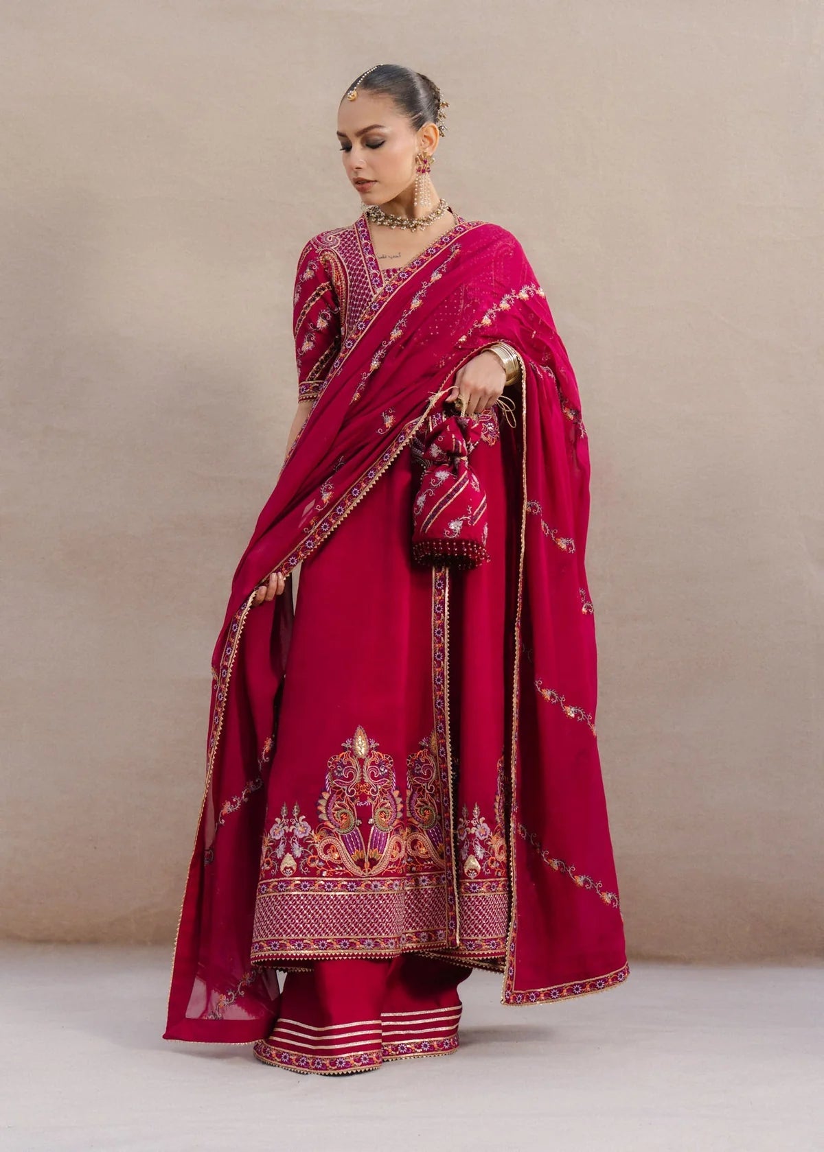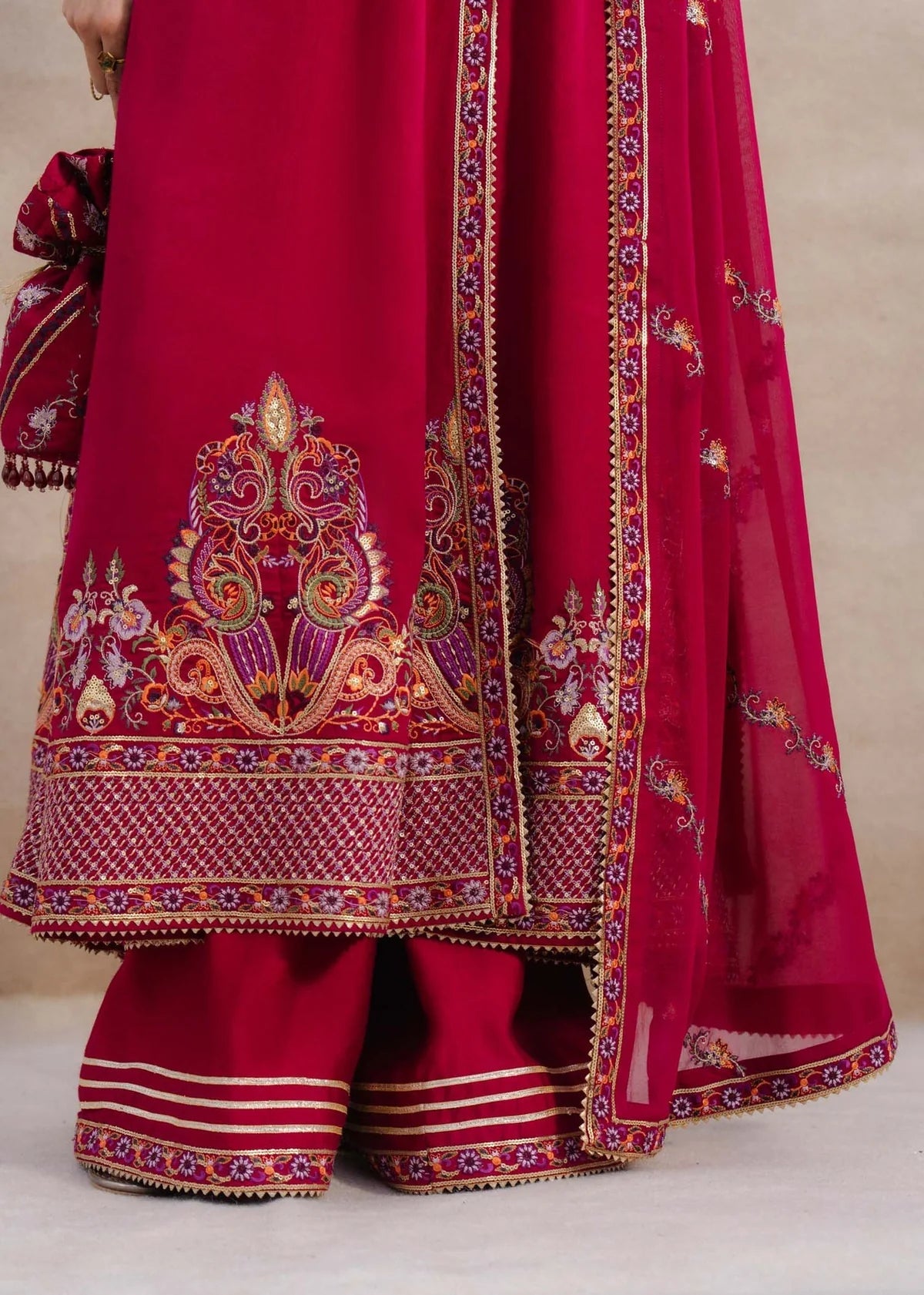 A shocking pink front-open cotton silk pishwas, embroidered at the hem and neckline in lilac, rust, green, plum, and pink.Accented with matte sitara on the borders and neckline. Paired with a long embroidered azaar and an embroidered chiffon dupatta, finished with gota ribbon and lace details.