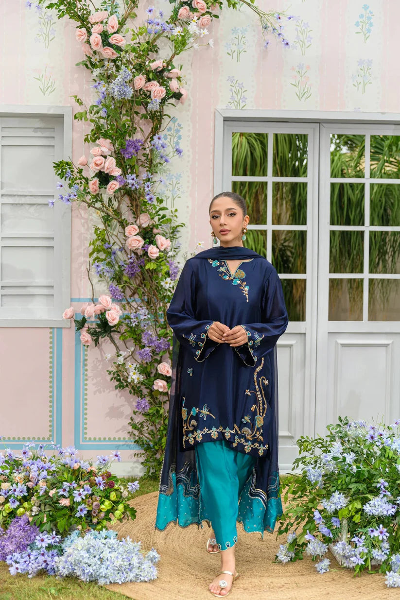 In our favourite duo of navy blue and Aqua Ocean, this ensemble is a true showstopper. The shirt’s neckline and daman are richly adorned with intricate dabka, kora, and resham work in radiant gold-bronze tones. The dupatta is beautifully handworked with delicate cutwork detailing, sequin accents, and subtle shades of sea green — a perfect blend of elegance and festive flair.