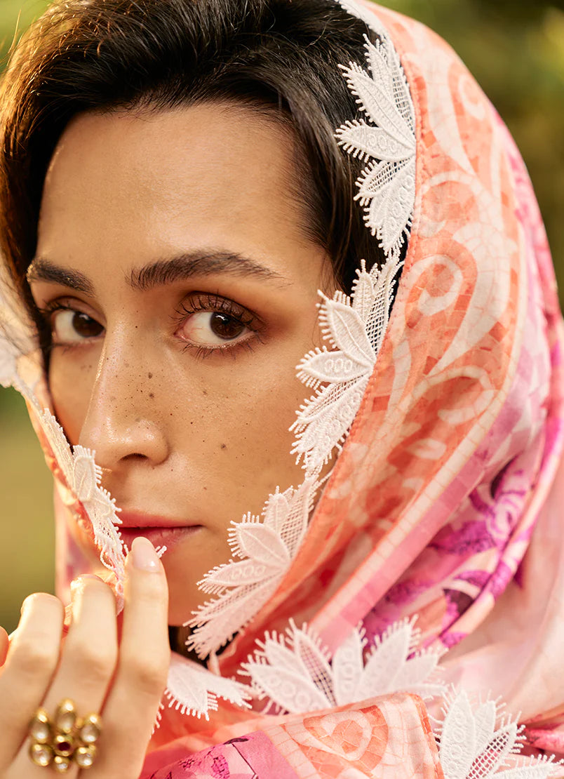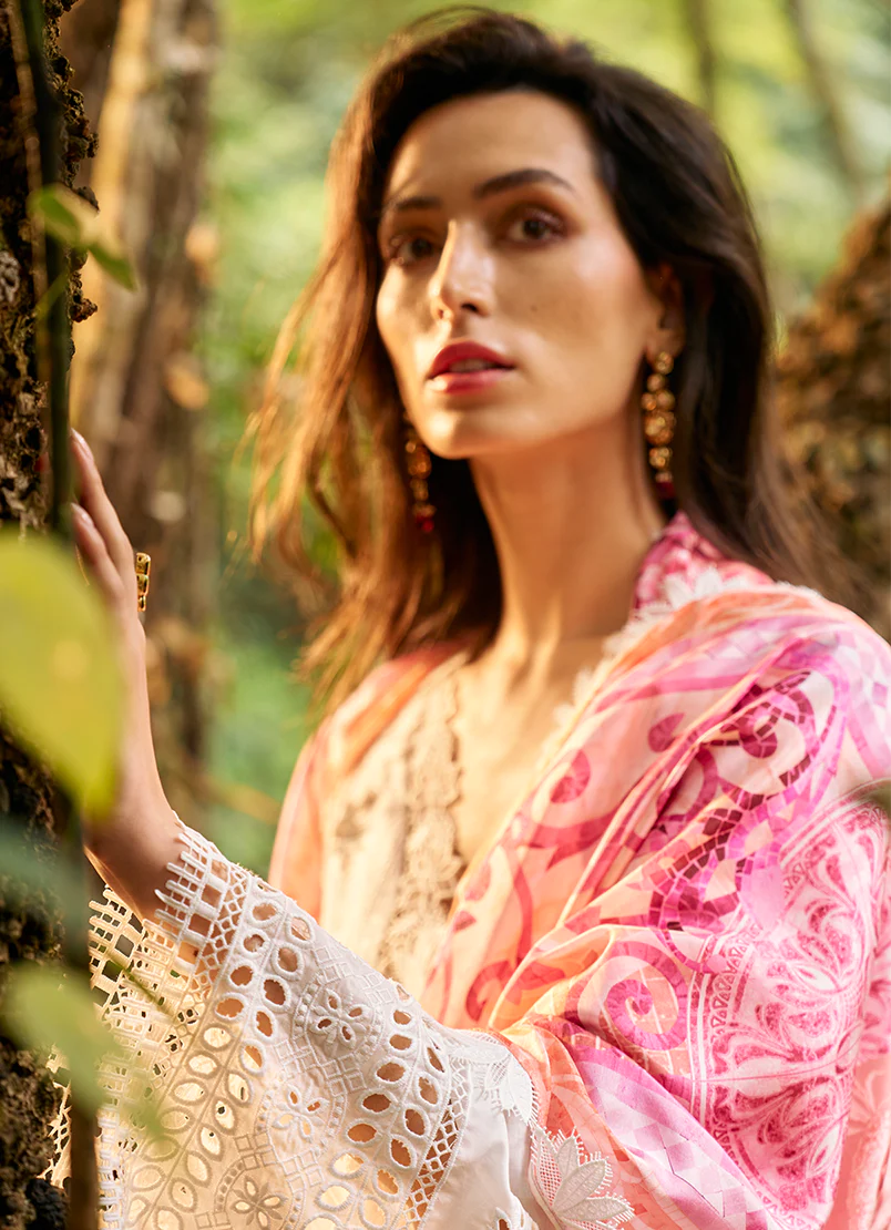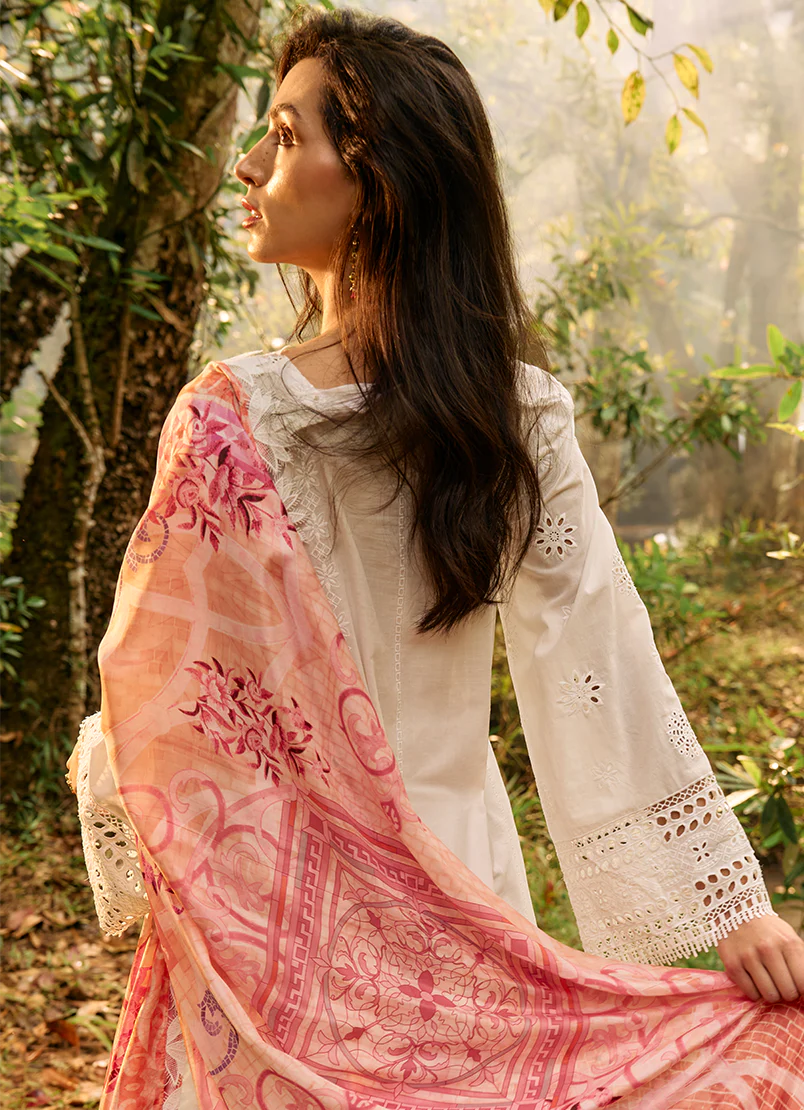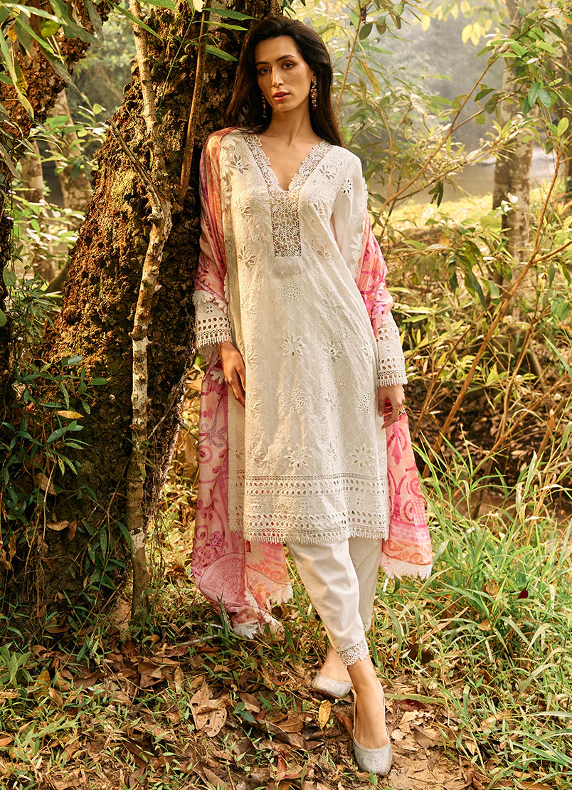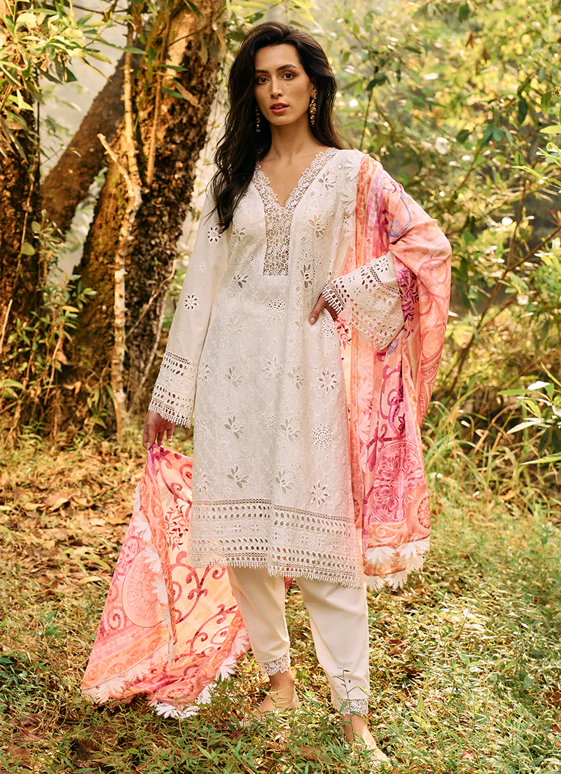 Unzilla is a classic white outfit with mesh work incorporated into the design. Cutwork borders embellish the shirt hemline and sleeves paired with a beautiful pure silk dupatta in hues of pink, Unzilla may be worn for years to come.