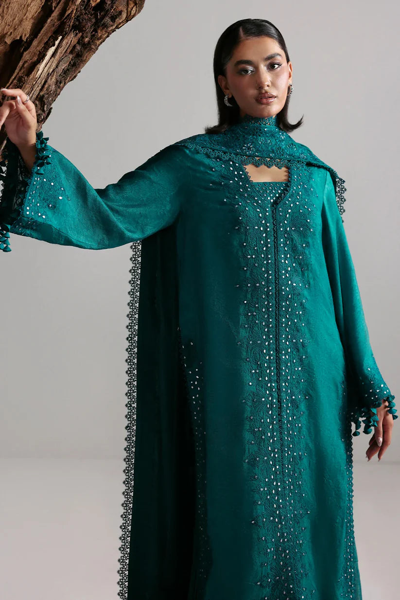 An ode to teal grandeur — this flowing silhouette is drenched in rich jewel tones, adorned with glistening embellishments that cascade like constellations. Paired with pleated gharara-style trousers and a statement dupatta, it strikes the perfect harmony between bold modernity and timeless sophistication.