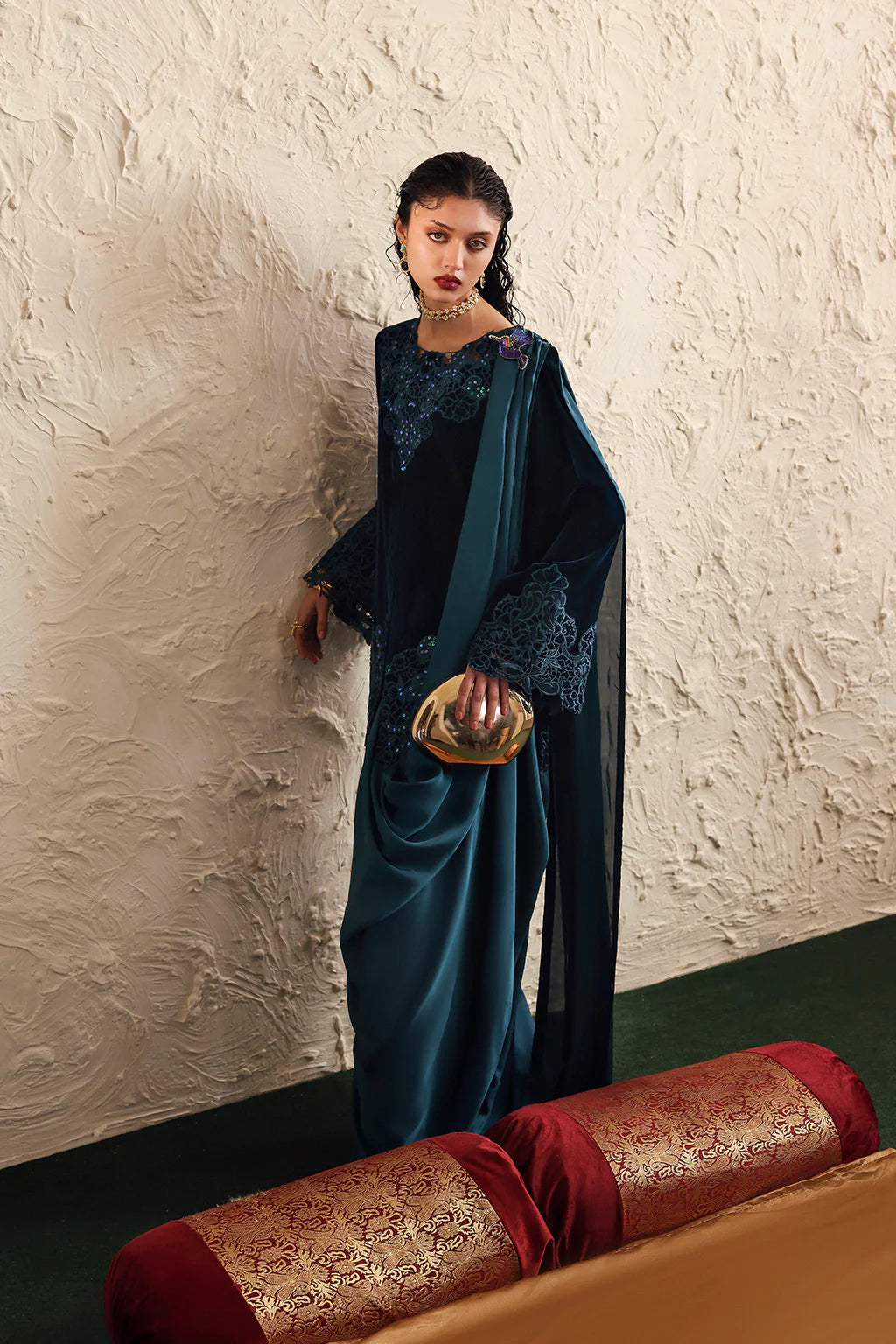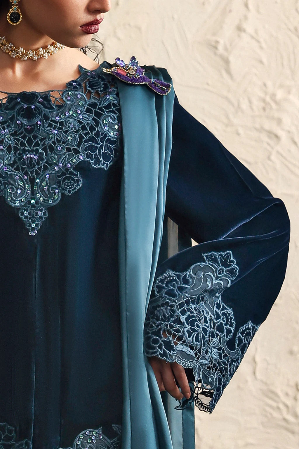 A refined teal blue velvet jacket featuring delicate cutwork embroidery and meticulous adda work, showcasing exceptional craftsmanship. It is beautifully paired with a fluid silk draped saree, creating an elegant ensemble perfect for festive occasions, formal events, or evening celebrations.