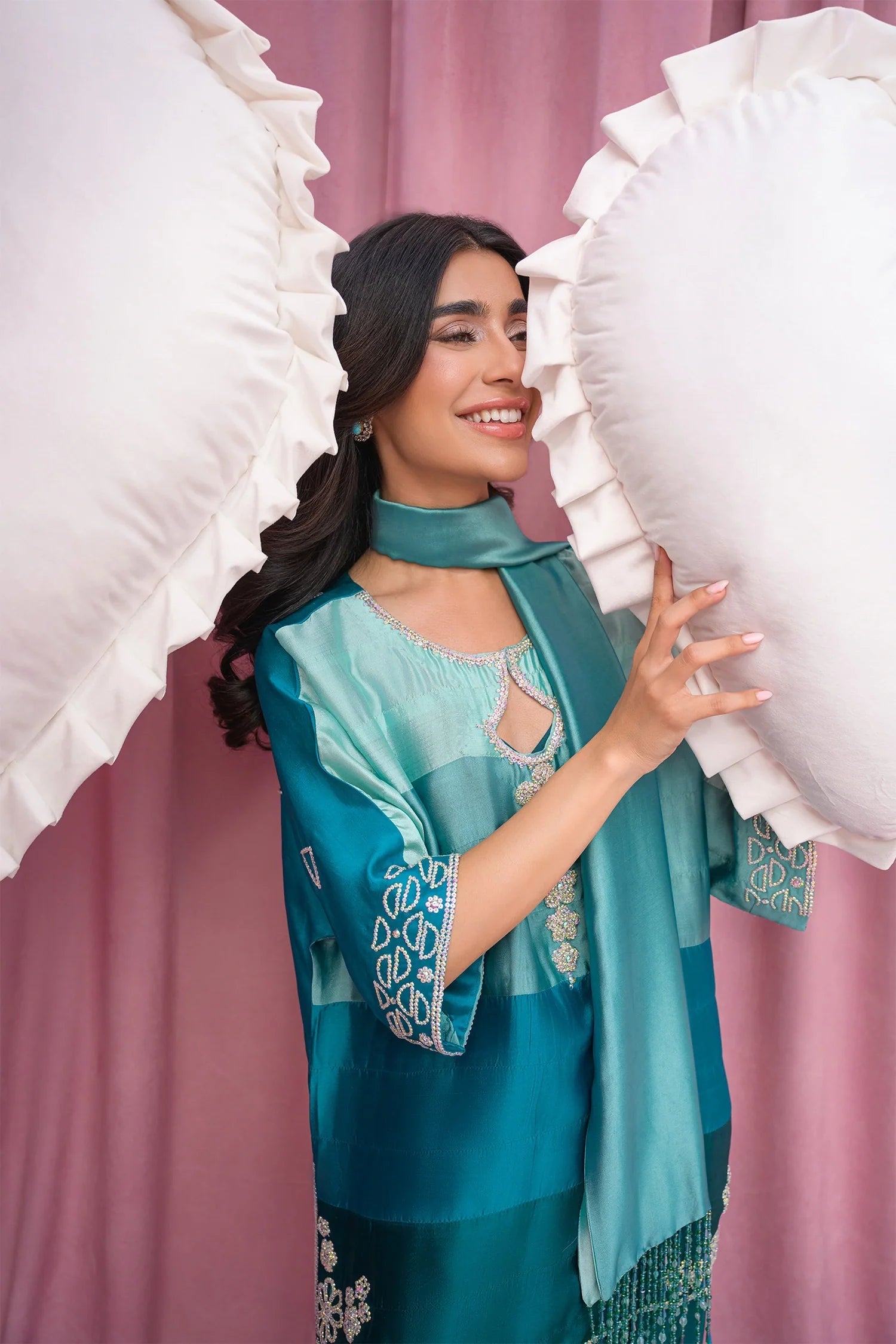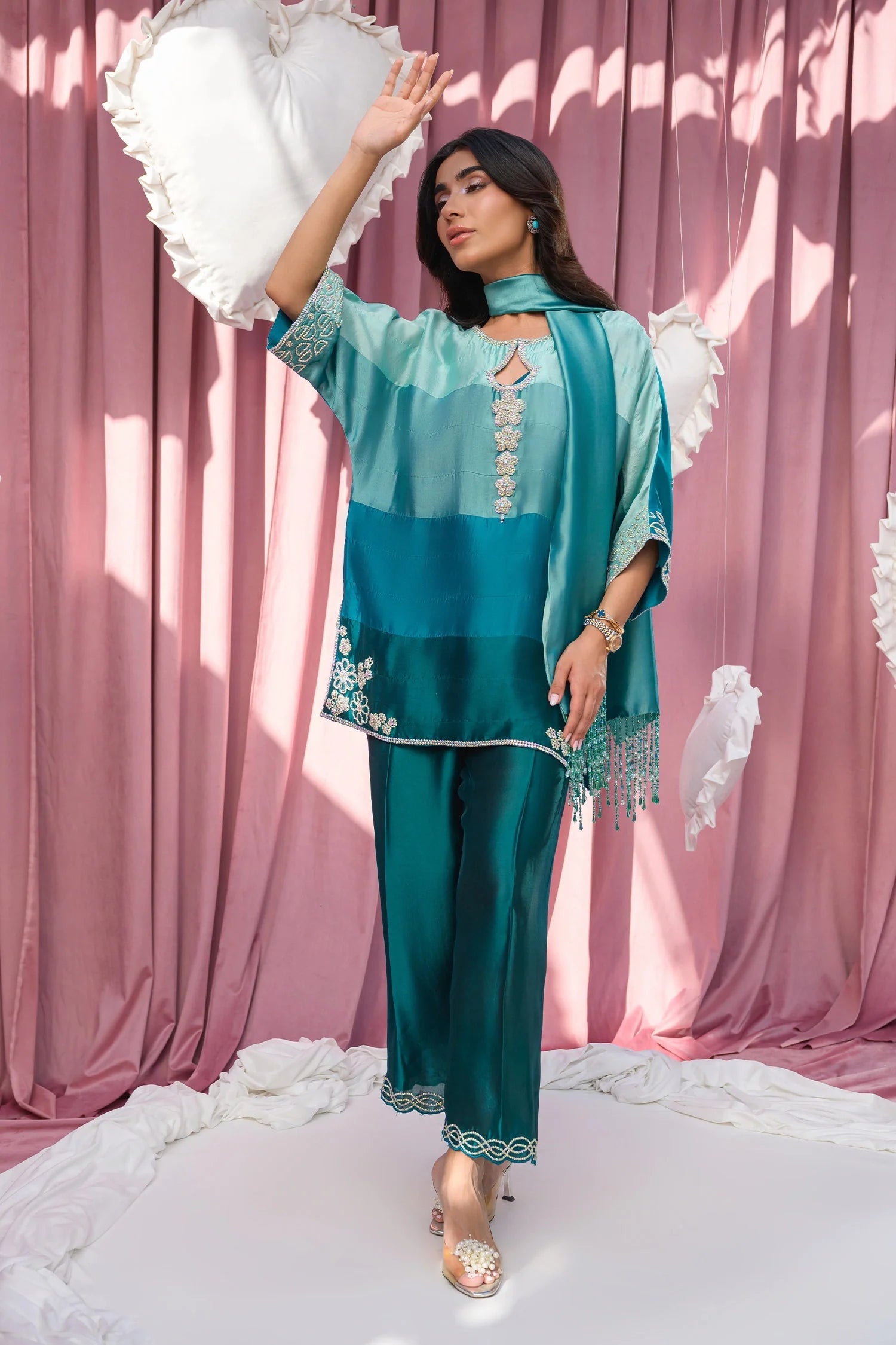 An Ocean & Turquoise Ombre Ensemble crafted in pure Sheesha silk, featuring horizontal color-gradient appliqués. The hand-embellished izaars and 3D Swarovski flowers on the neckline add a luxurious touch, while the matching Sheesha silk stole with hanging crystals completes the look.