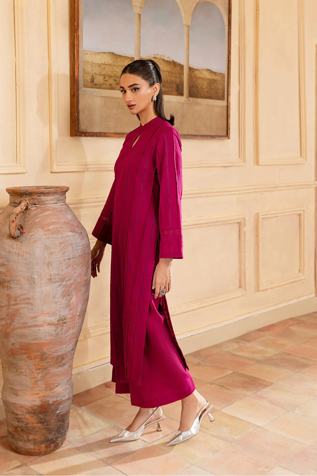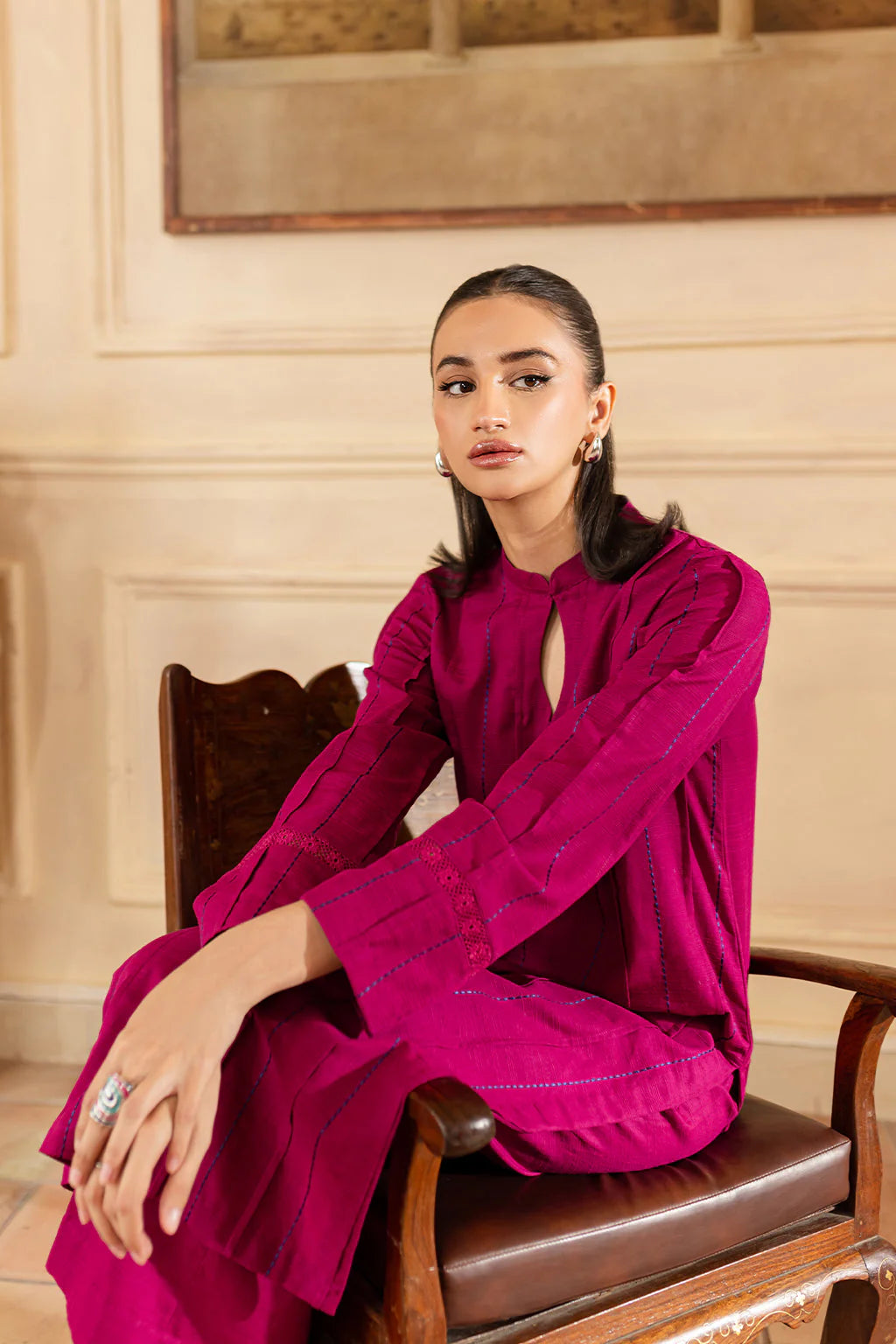 - Fuchsia embroidered shirt with lace detailing, paired with wide legged trousers
