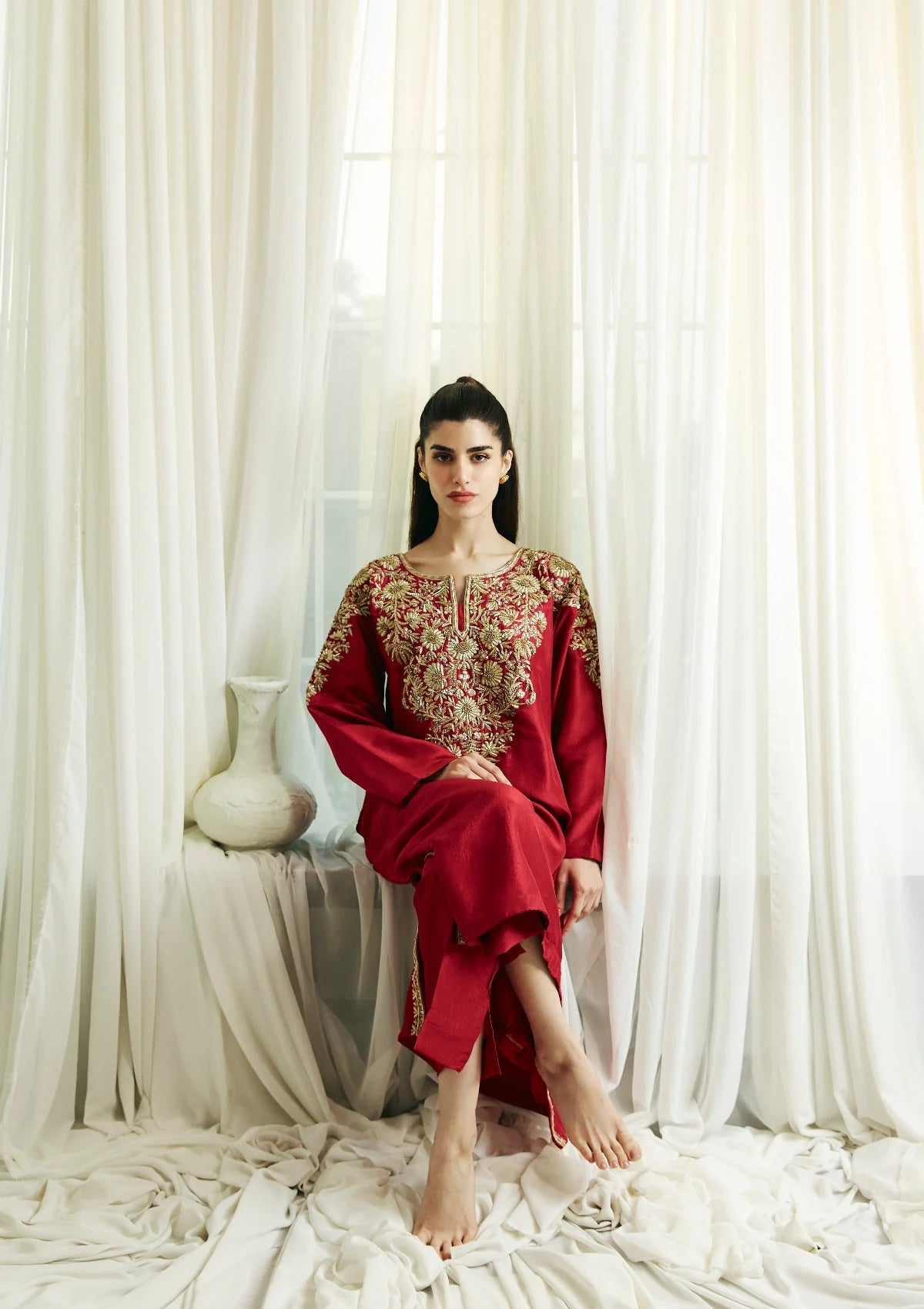 * Yara comes as a two-piece outfit, an oversized phiran with straight pants; hand-embellished on 80g pure raw silk with dabka, naqshi, stones and sequins. For Yara, our inspiration comes straight from a Kashmiri phiran.