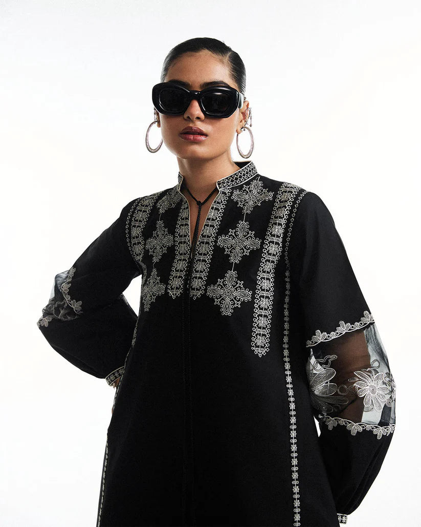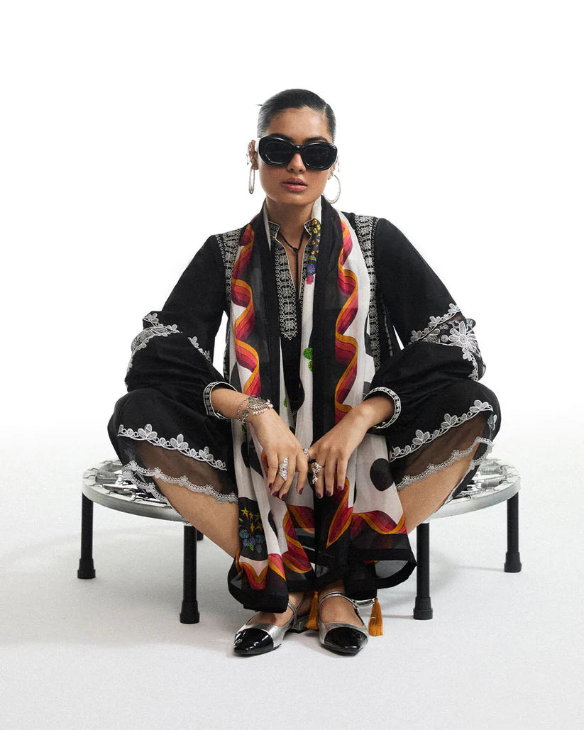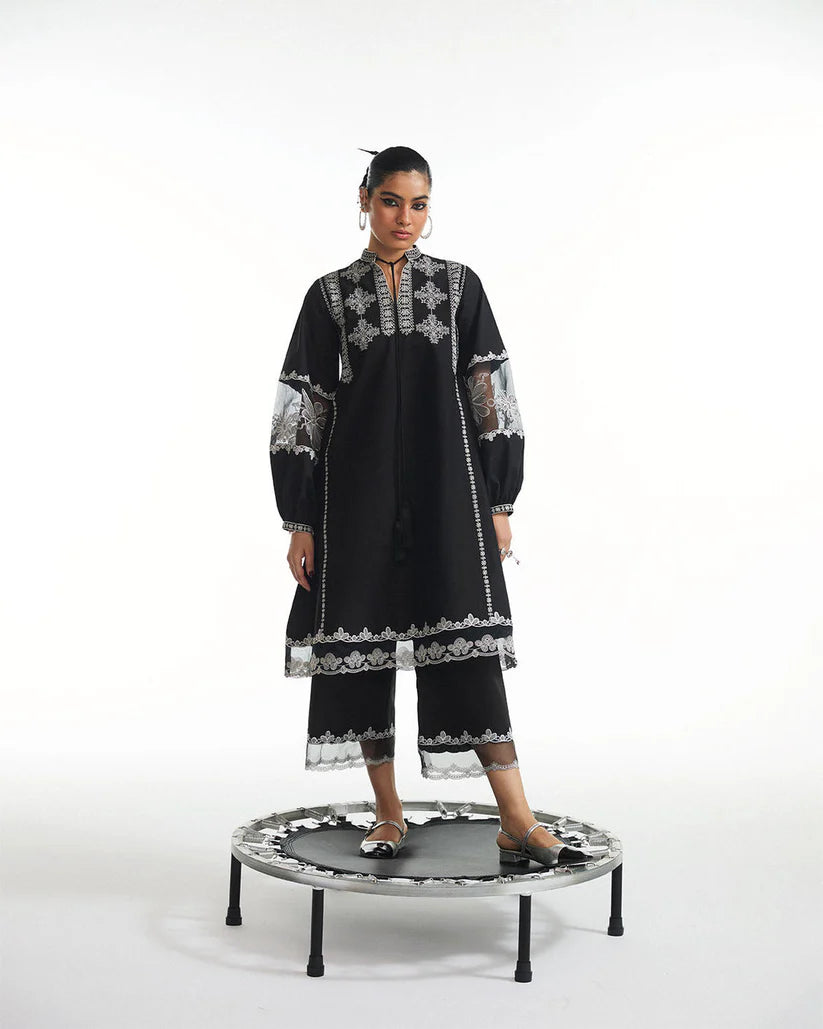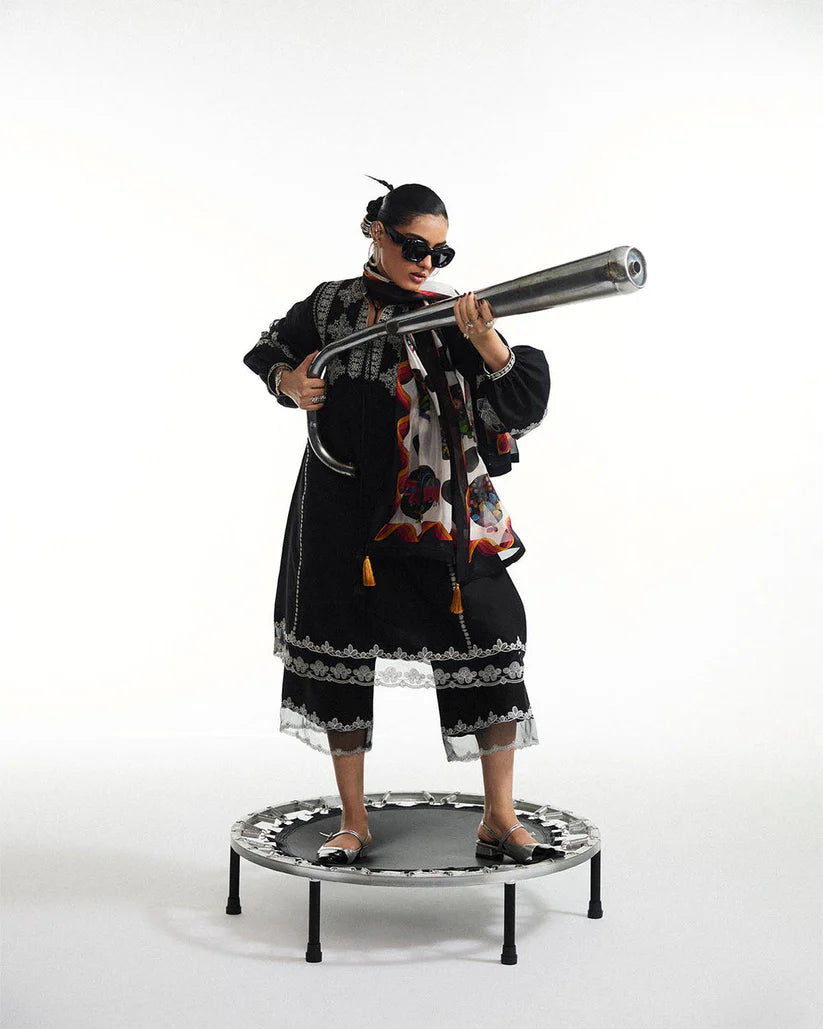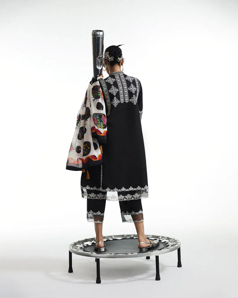This black ensemble blends classic embroidery with a modern, effortless silhouette. The long shirt is detailed with delicate white threadwork along the neckline, sleeves, and hem, giving the piece quiet texture and depth. Subtle tassels at the front and full balloon sleeves add a sense of movement and shape. It's paired with cropped, wide-leg culottes that mirror the shirt’s embroidery for a seamless finish. A lightweight digitally printed silk scarf introduces soft color and pattern, tying the look together with understated sophistication. The result is a look that feels intentional, composed, and easy to wear.