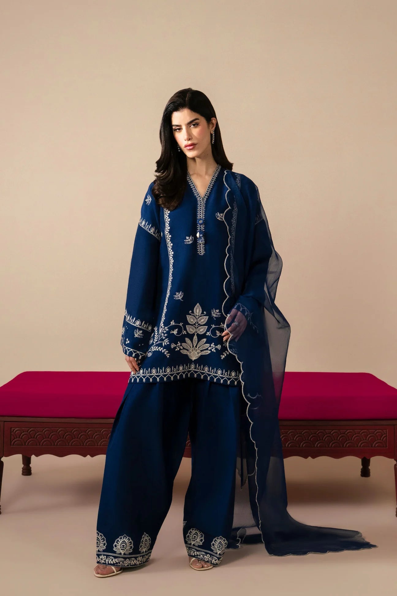 Discover the transcendent allure of Serelis — a reverie spun in midnight silk. Awash in the deep glow of navy, the ensemble shimmers like moonlight rippling across still waters. Ethereal ivory florals unfurl over the sumptuous raw silk canvas, whispering poetry in every thread. A diaphanous organza dupatta, framed with delicate embroidery, drapes with effortless grace, while the farshi shalwar blooms in intricate motifs reminiscent of celestial gardens. Enchanting, timeless, and impossibly refined — Serelis embodies the essence of fall’s most luxurious dream, where opulence feels weightless and elegance becomes emotion.