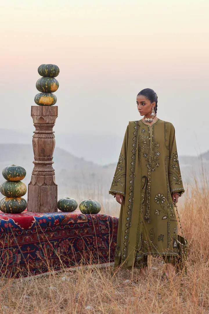 Nayra — Crafted on plush winter karandi, this olive-toned ensemble blooms with bold paisley motifs and free-flowing tribal florals. Raw edges, textured stitches, and earthy embellishments come together to create a look that feels grounded, moody, and beautifully untamed.
