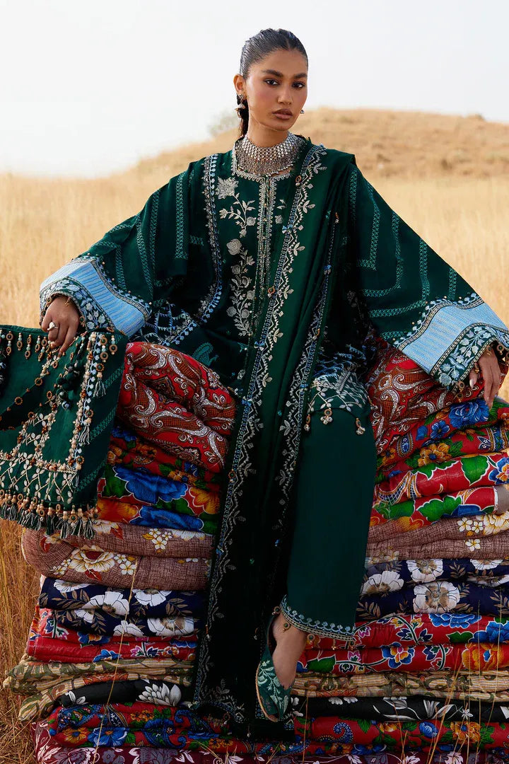 Yasmin — winter green jacquard khaddar shirt and trouser, layered with a soft woolen shawl, infused with steel-blue tribal echoes. Each thread whispers the stories of ancestral motifs, stitched with care, weaving a quiet winter tale that moves with effortless elegance. Moody, grounded, and timeless — Yasmin is winter embodied.