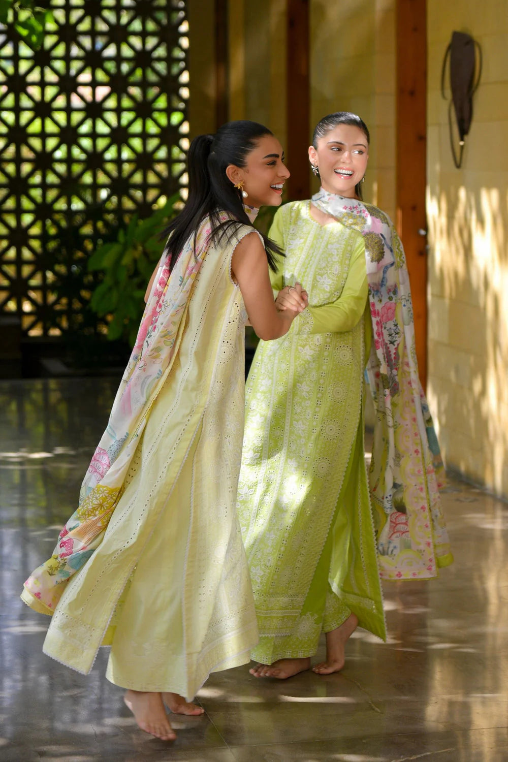 Radiate subtle elegance in this butter yellow ensemble. The highlight is a beautiful silk dupatta with a delicate lace trim, featuring a captivating animation that adds a touch of ethereal charm. The shirt is crafted with intricate white-tone Schiffli embroidery and boasts a refined lace neckline. Adding to the detailed design is an embroidered back shirt and coordinating embroidered izaar trousers, creating a cohesive and gracefully detailed look in a soft, summery hue.
