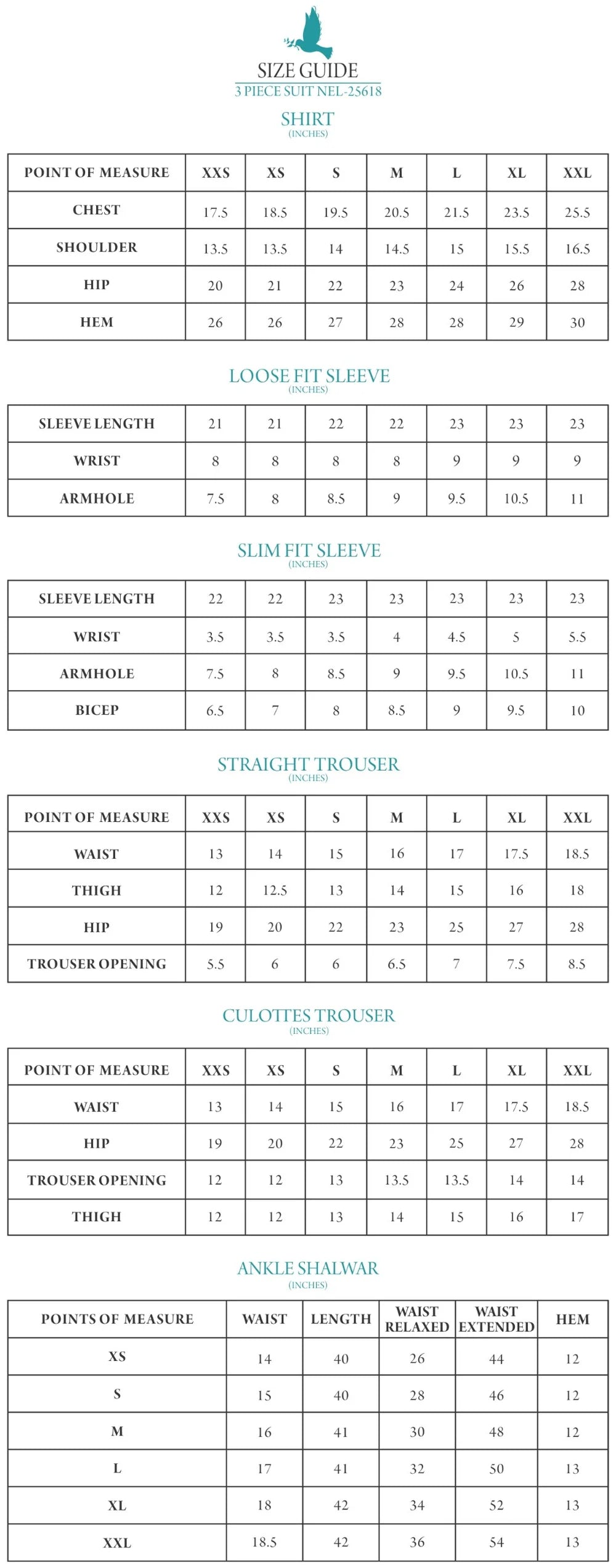 | Daaman | 21 - 22" | 23.5 - 23.5" | 23.5 - 24" | 25 - 26" | 26.5 - 27" |