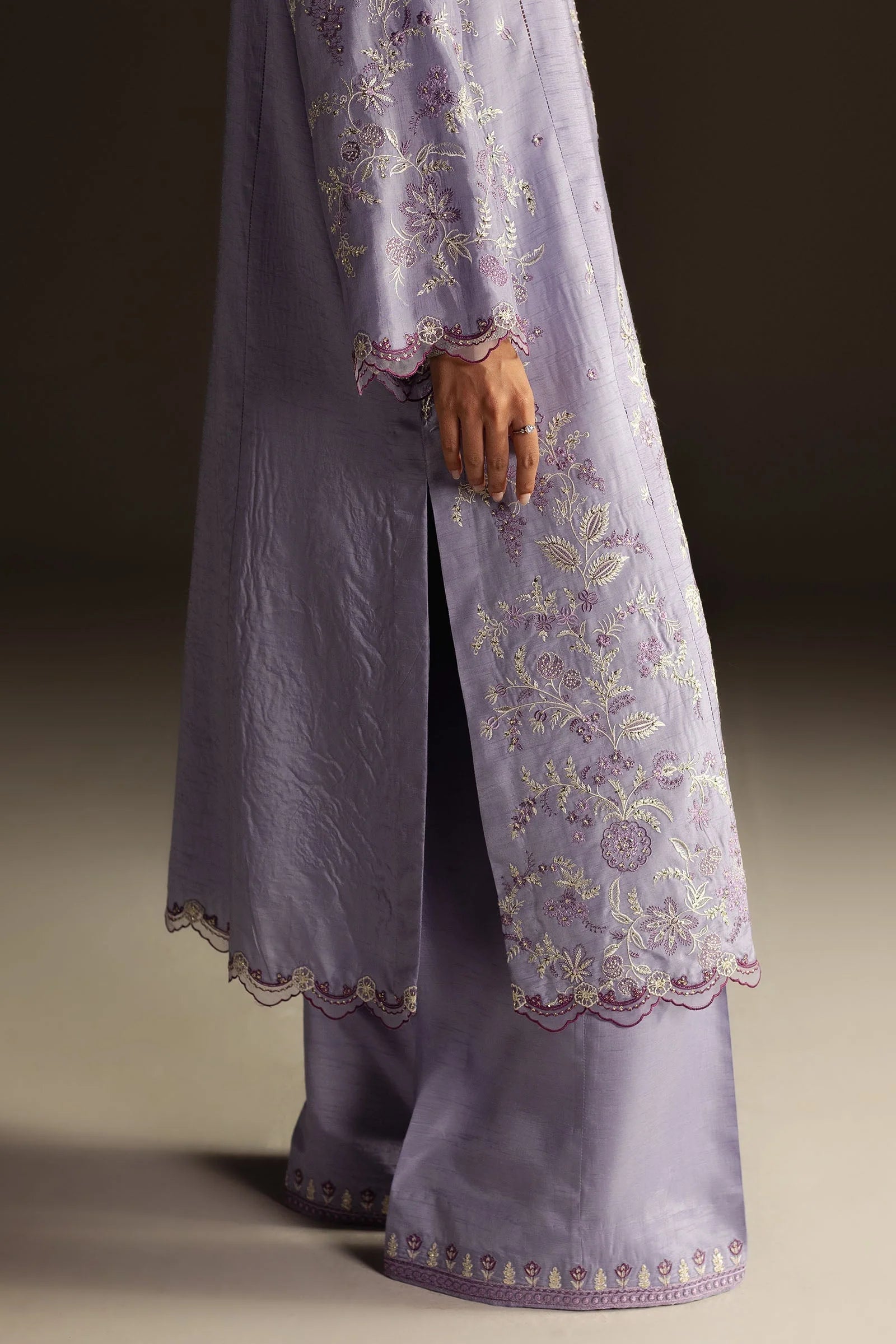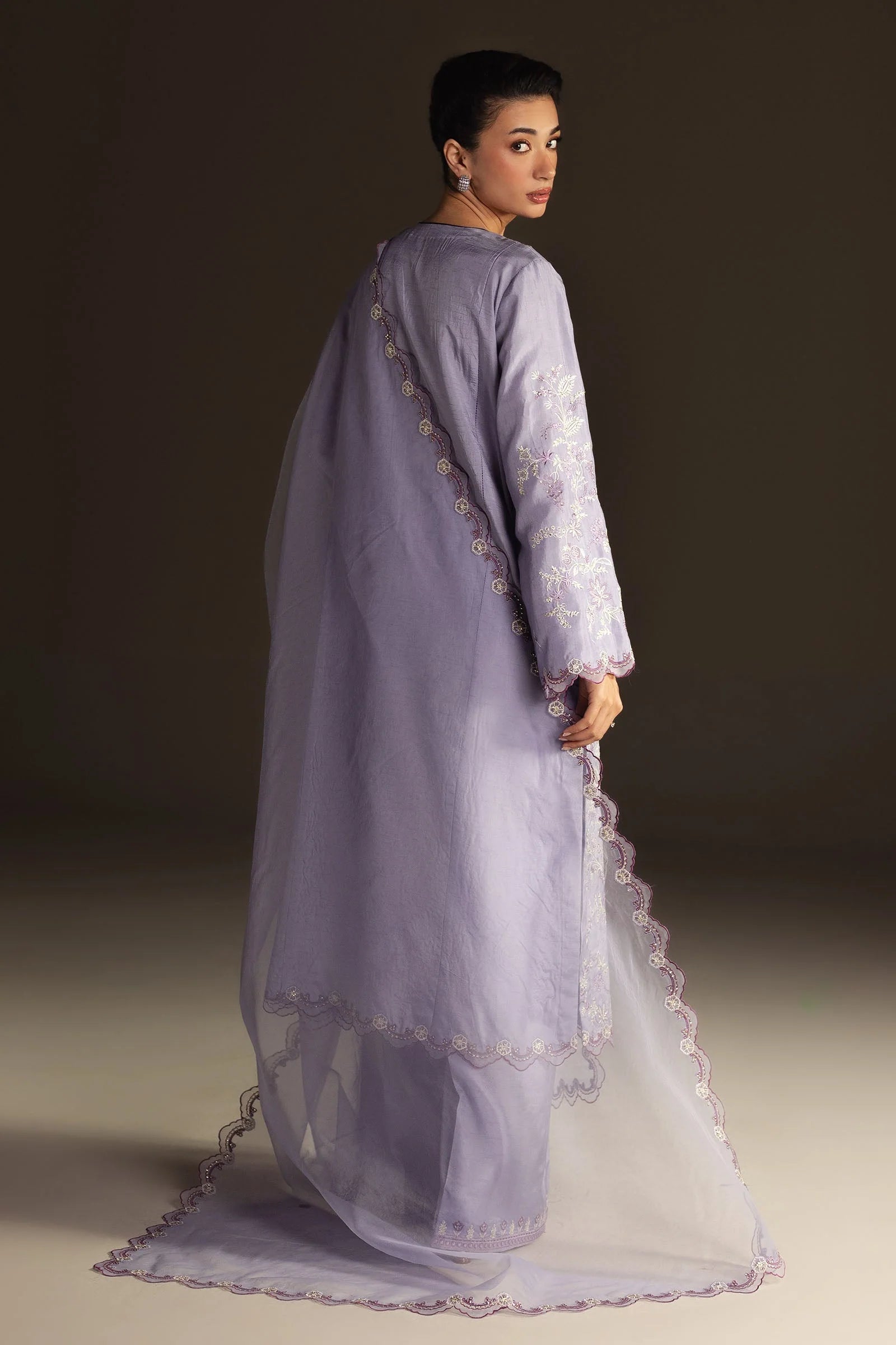 Ethereal and graceful, Nayra in lilac captures the essence of festive elegance. The flowing shirt is adorned with signature embroidery in ivory and purple tones, paired with embroidered straight trousers. The look is completed with a sheer organza dupatta featuring delicate embroidery.