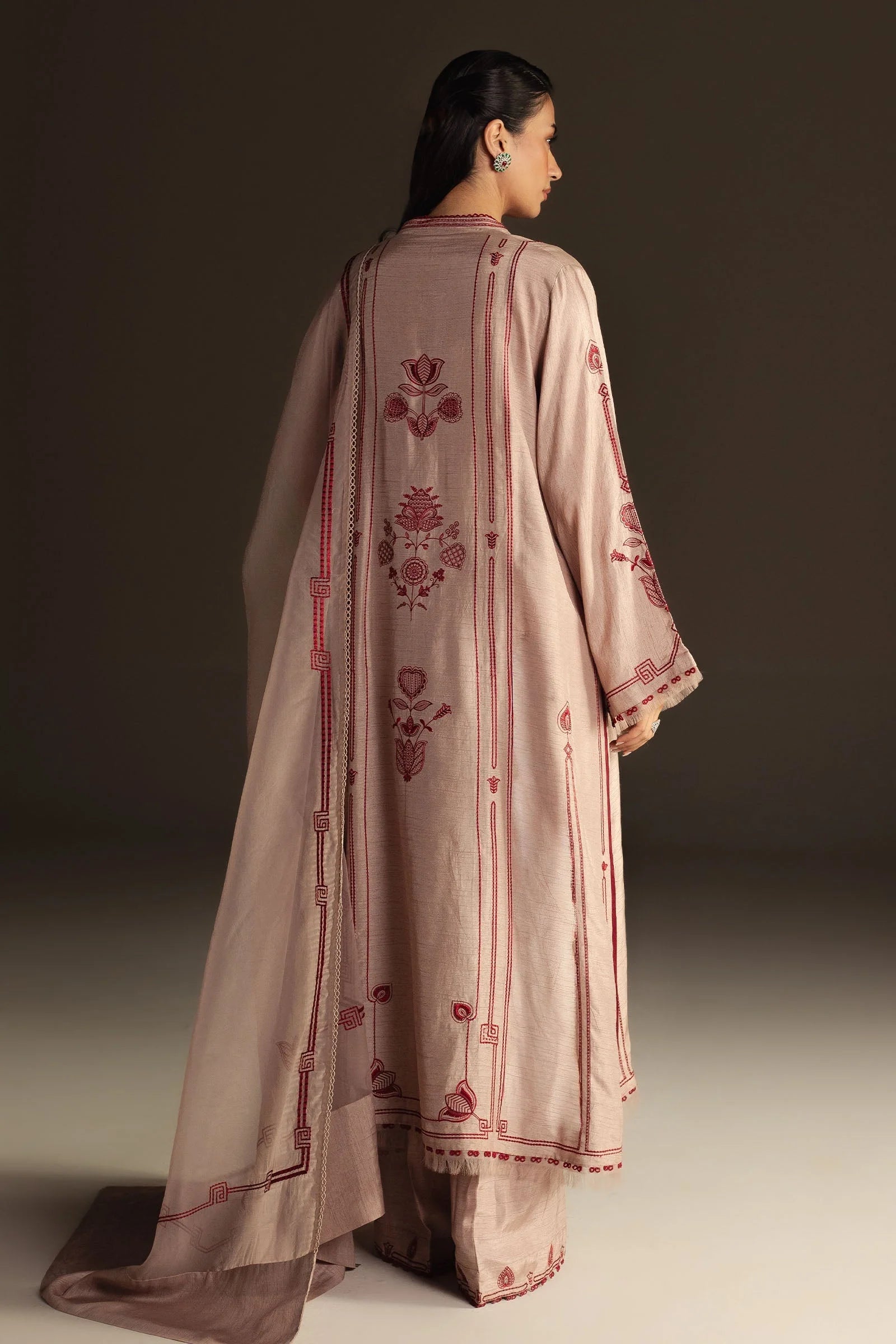 Raina, a sand-toned ensemble features bold crimson embroidery that beautifully contrasts its soft base. The medium raw silk shirt is adorned with delicate lace trims and intricate threadwork, paired with straight-fit embroidered trousers that offer a graceful structure. Completing the look is a sheer organza dupatta finished with fine silk borders on the pallu.