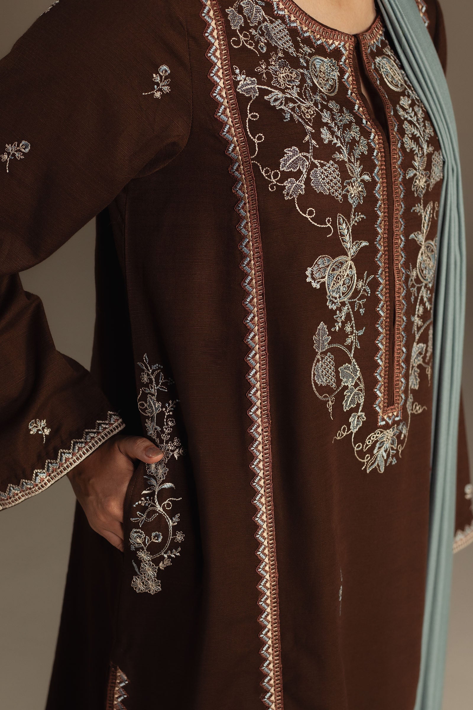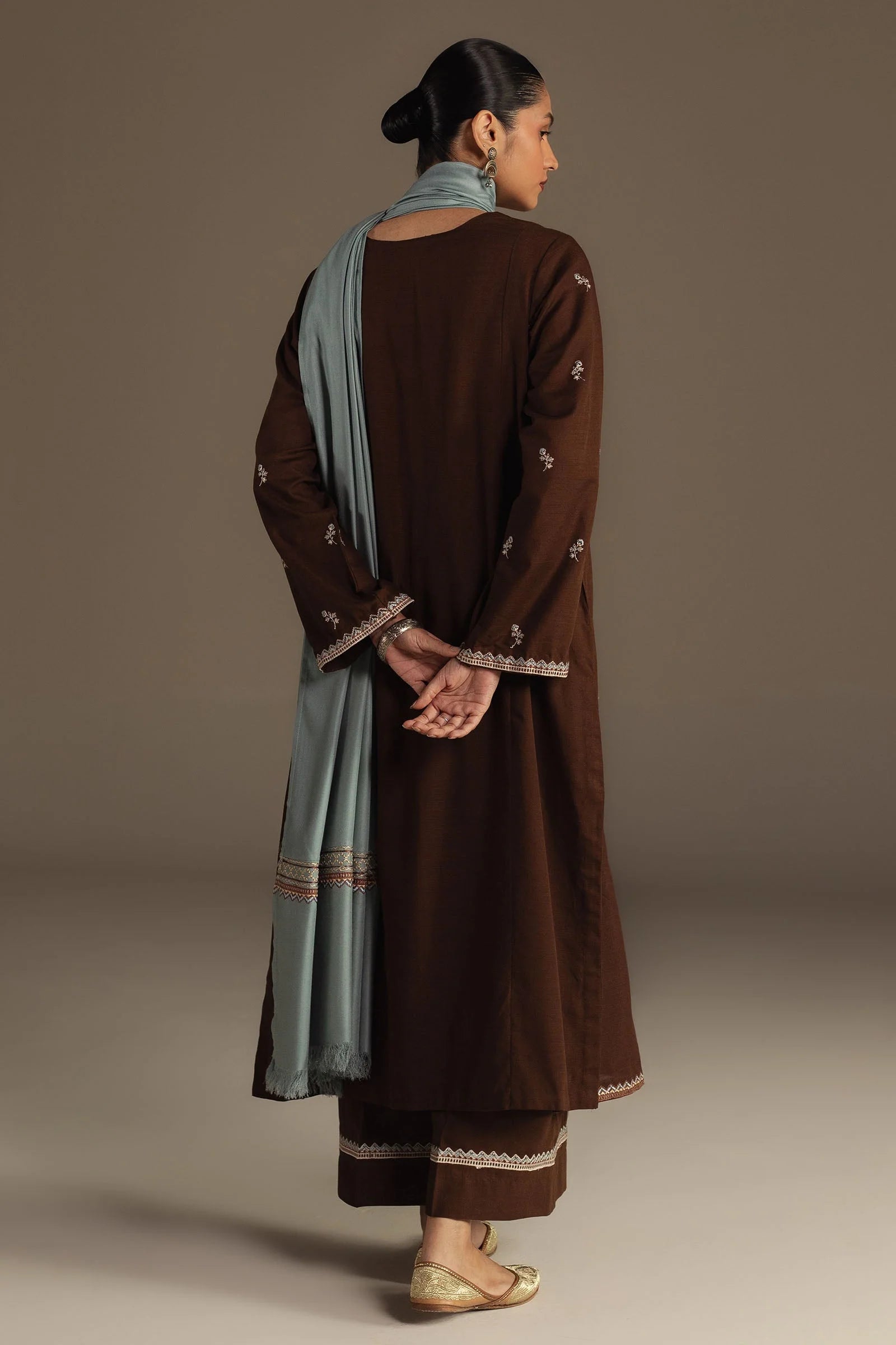 A rich brown paneled kurta paired with matching wide-hem khaddar pants that exudes effortless sophistication. The contrasting shawl in a captivating hue adds warmth and depth, creating a graceful balance of comfort and style.