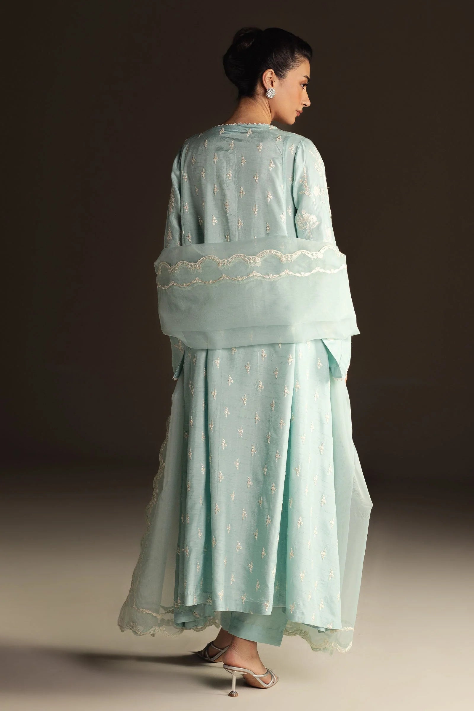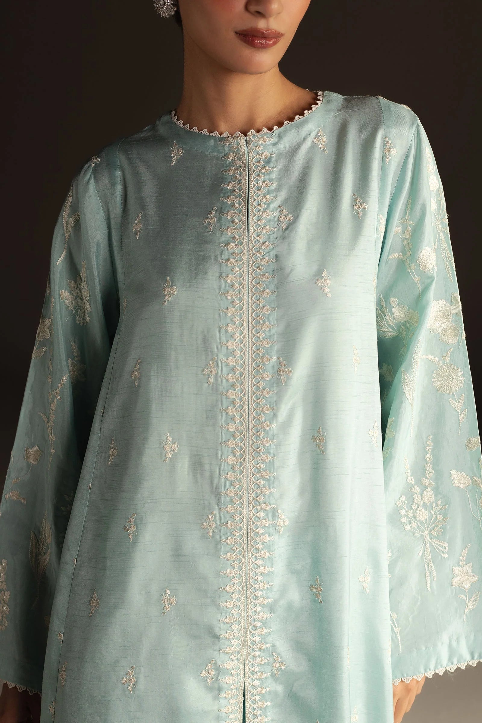 A soft light blue ensemble, Ruqaiya reflects meticulous craftsmanship. The raw silk shirt features elegant ivory embroidery that adds depth and texture to the serene palette. Paired with tapered shalwar and an embroidered organza dupatta, its an effortlessly refined festive look.