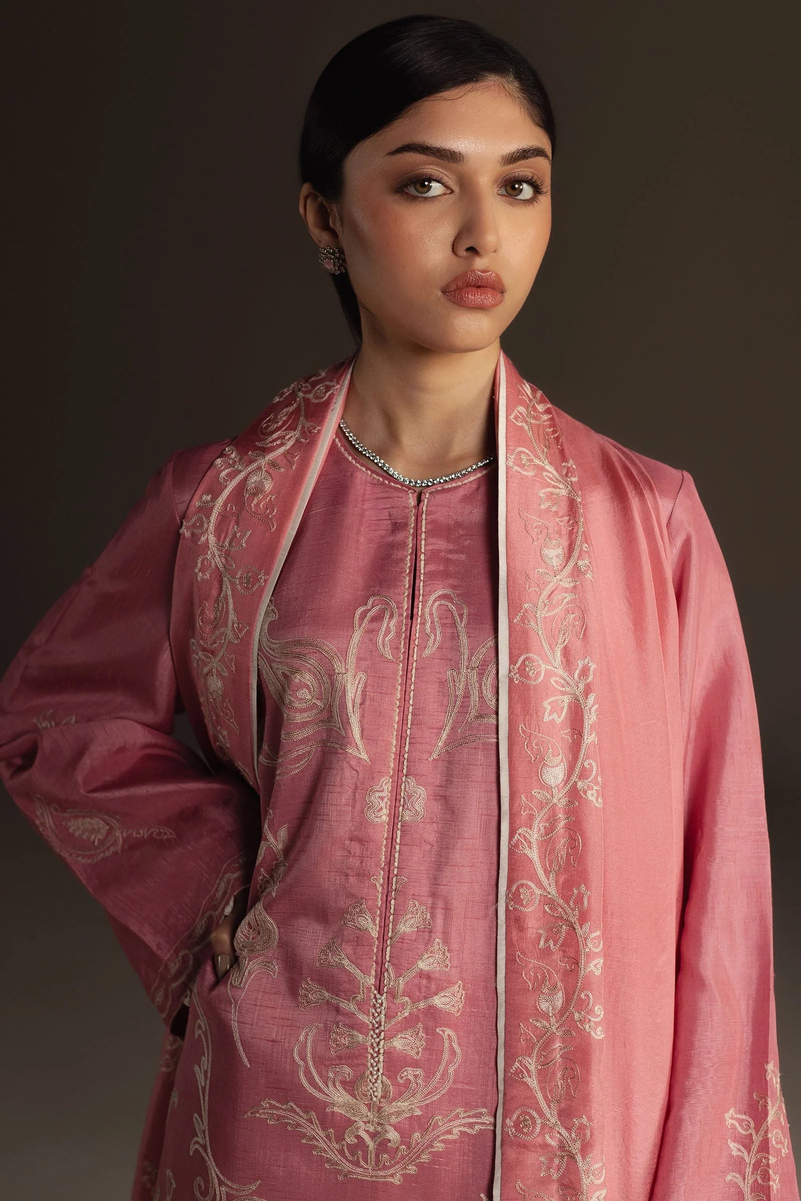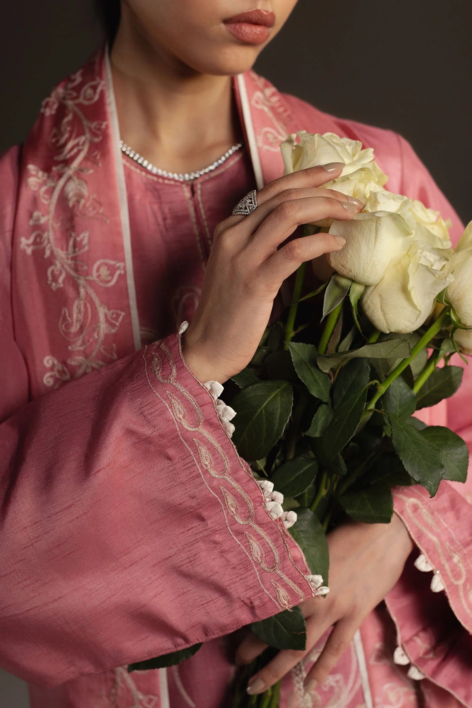 Soft and romantic, Zoya in rose pink exudes refined femininity. The raw silk shirt is embellished with aari embroidery and delicate handwork, paired with loose-fit trousers for a relaxed yet elegant silhouette. The ensemble is completed with a silk dupatta featuring embroidery and ivory contrast finishing with a graceful celebration of craftsmanship.