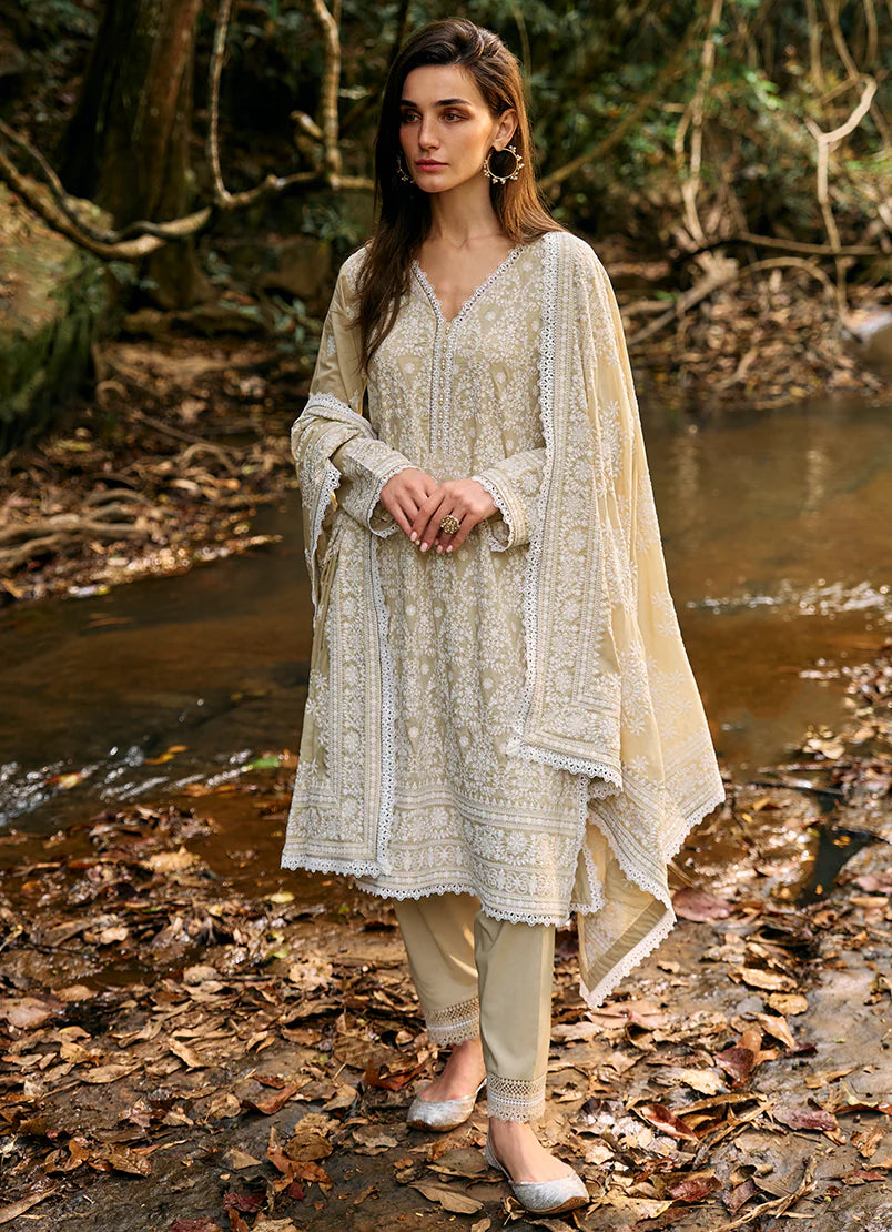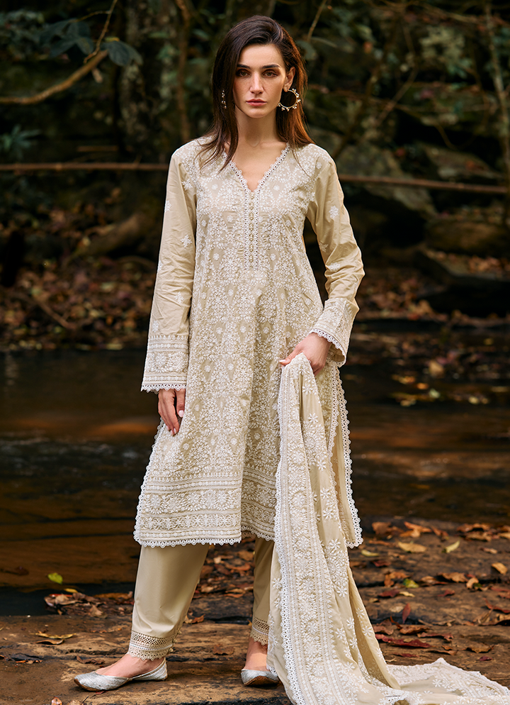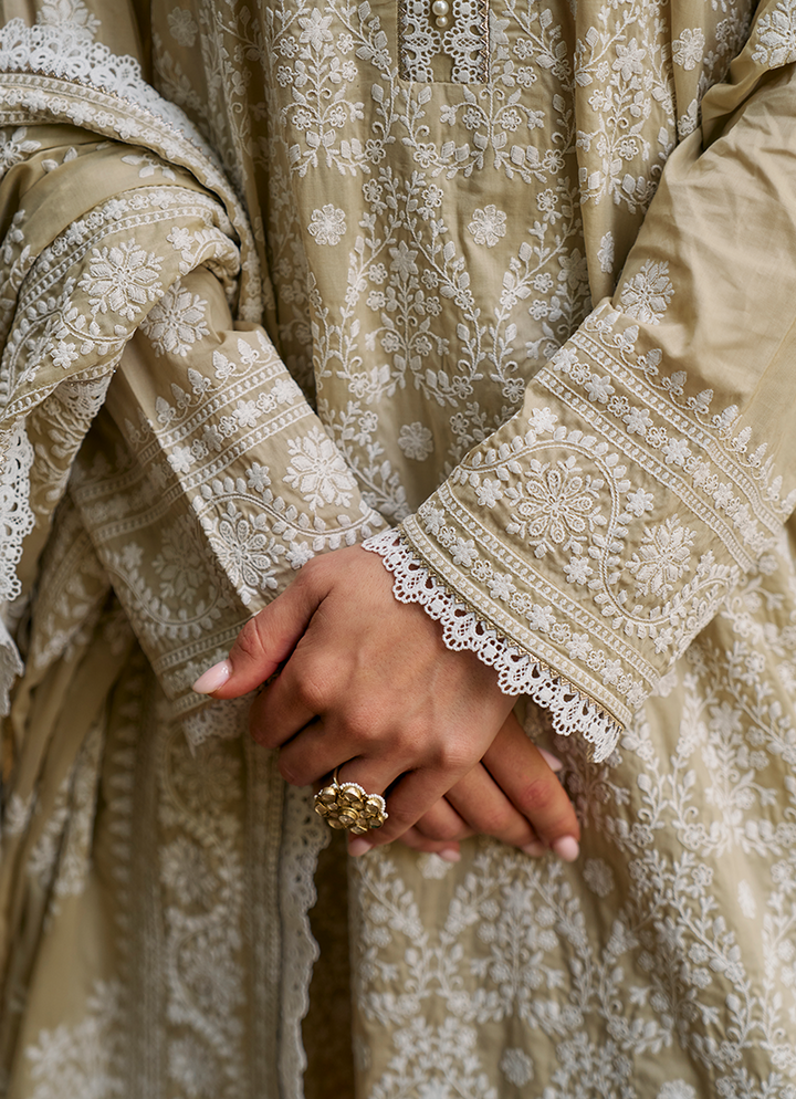 Zareen, a classic craftsmanship showcasing the elegance of the East i.e fine Chikankari embroidery on shirt, trousers paired with a beautifully embroidered dupatta.