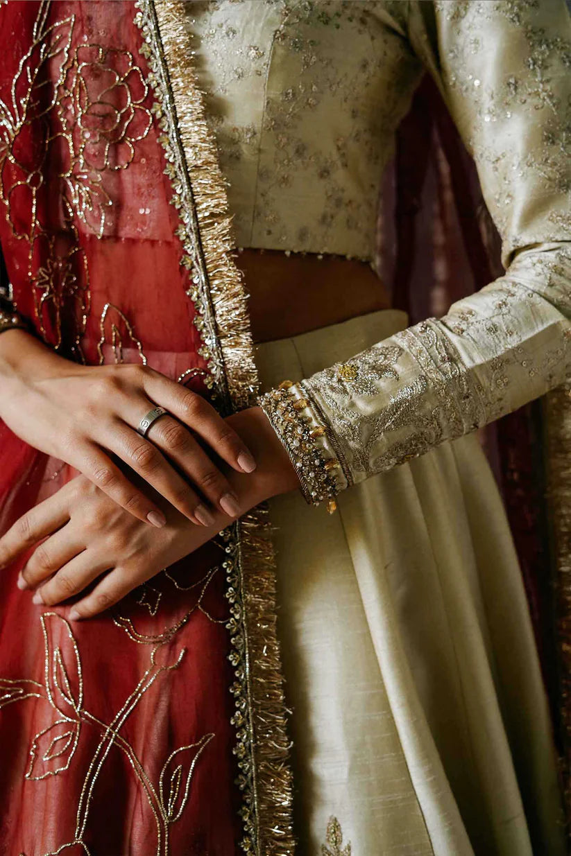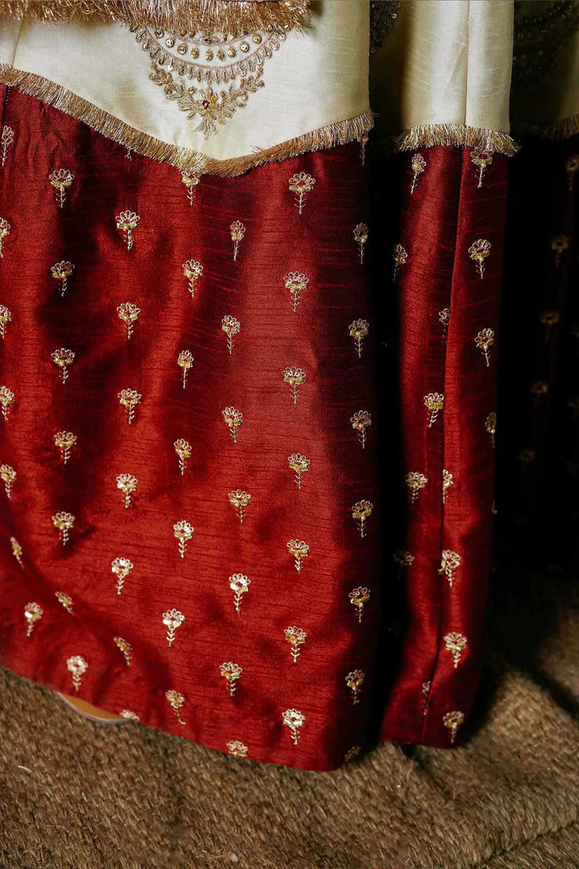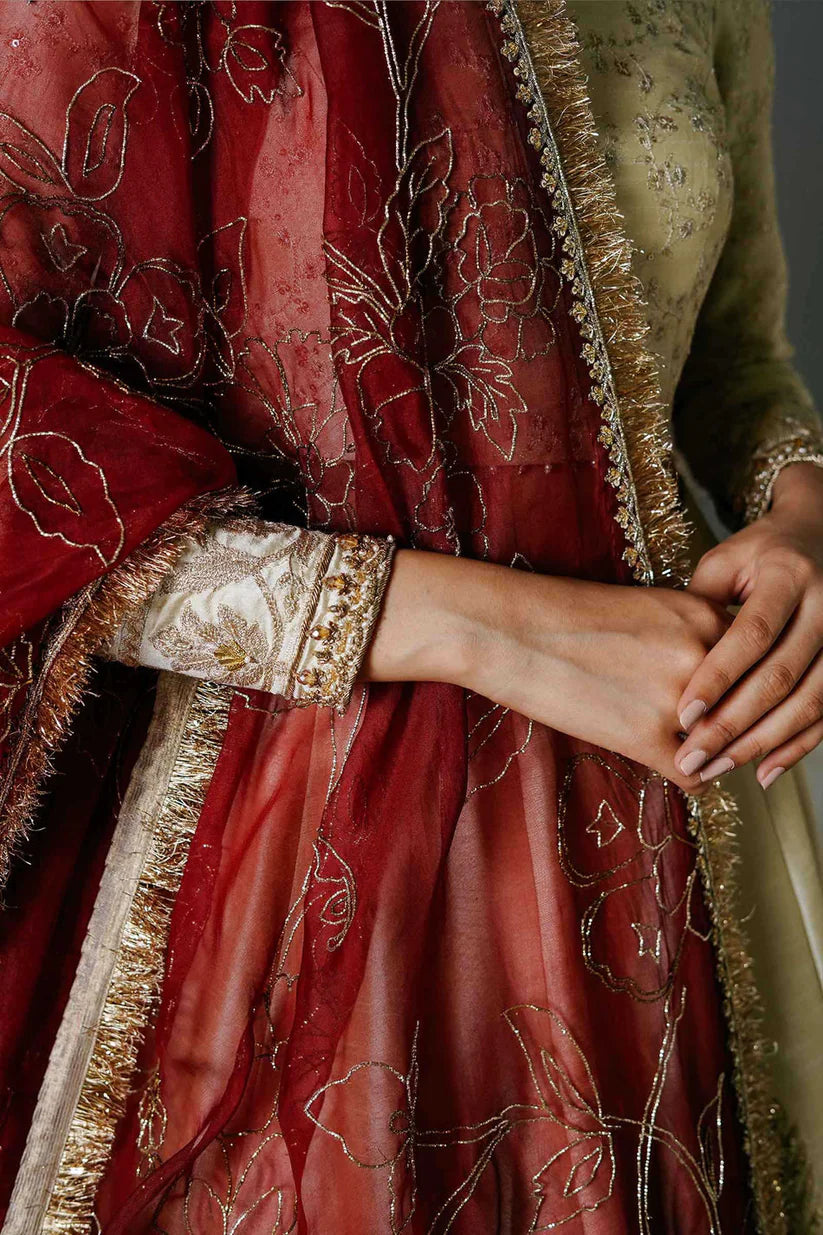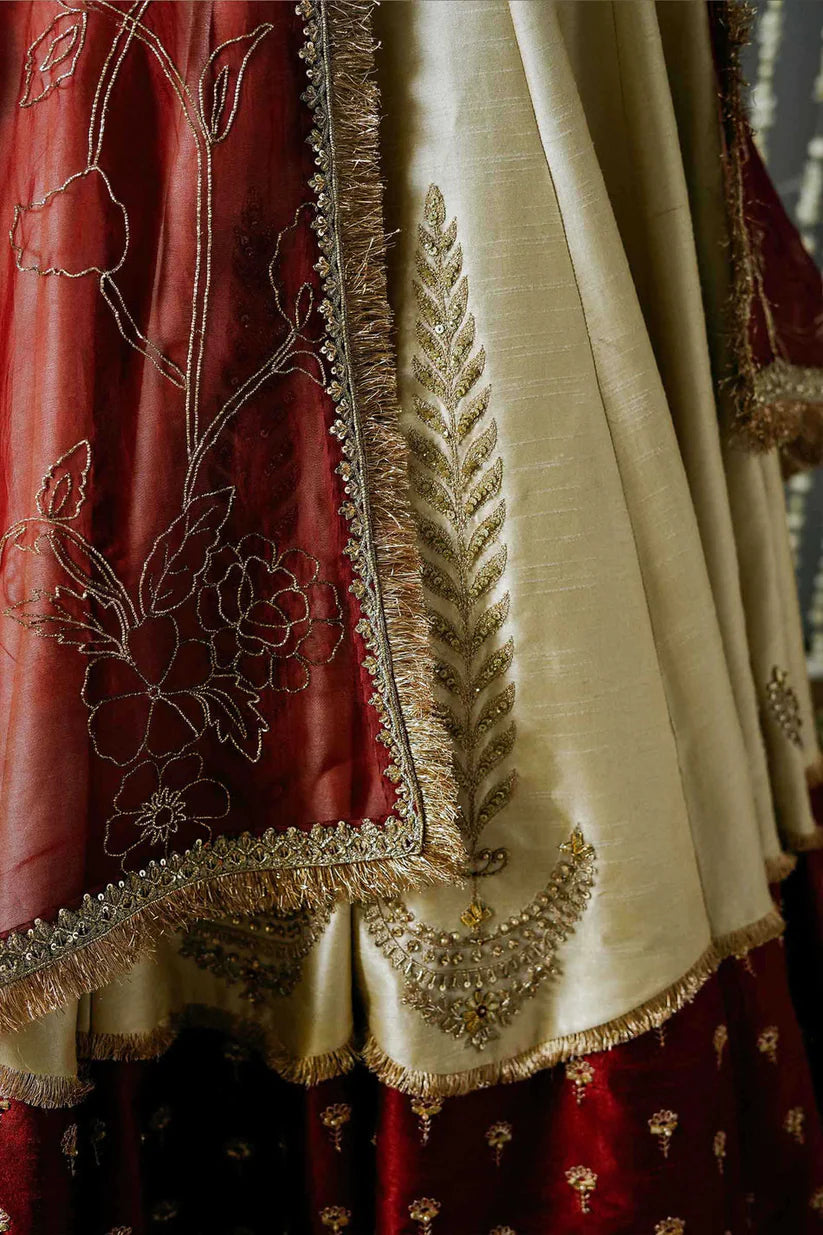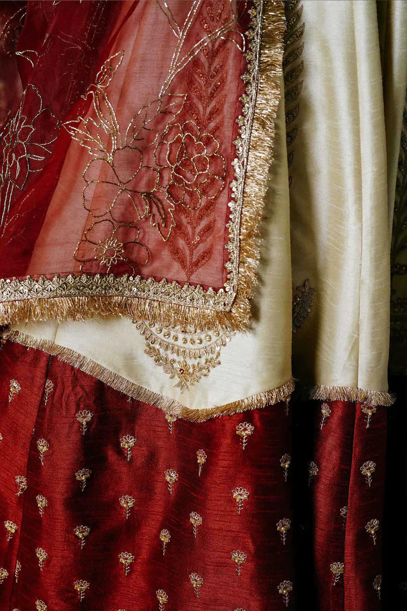 A fully embellished color blocked lehnga with gotta work and hazar boti on the bottom and elaborate motives towards the top. It is paired with a richly embroidered sequence jaal choli, embellished with a jeweled neckline and border on the sleeves. The look is completed with a deep red dupatta with our staple floral jaal made in naqshi and intricate sequence boarder.