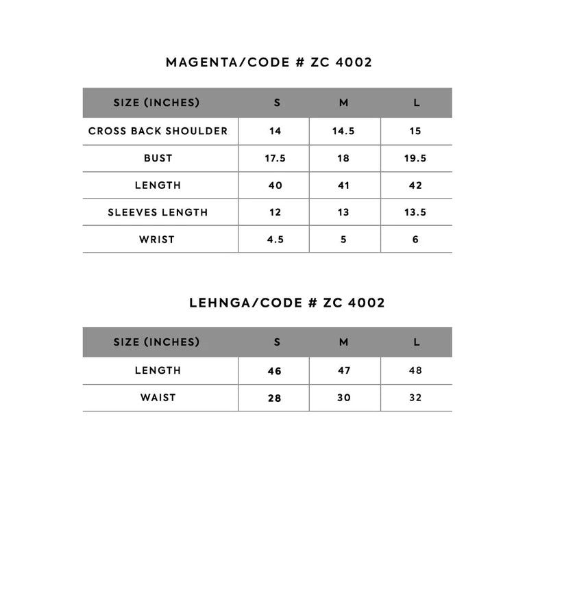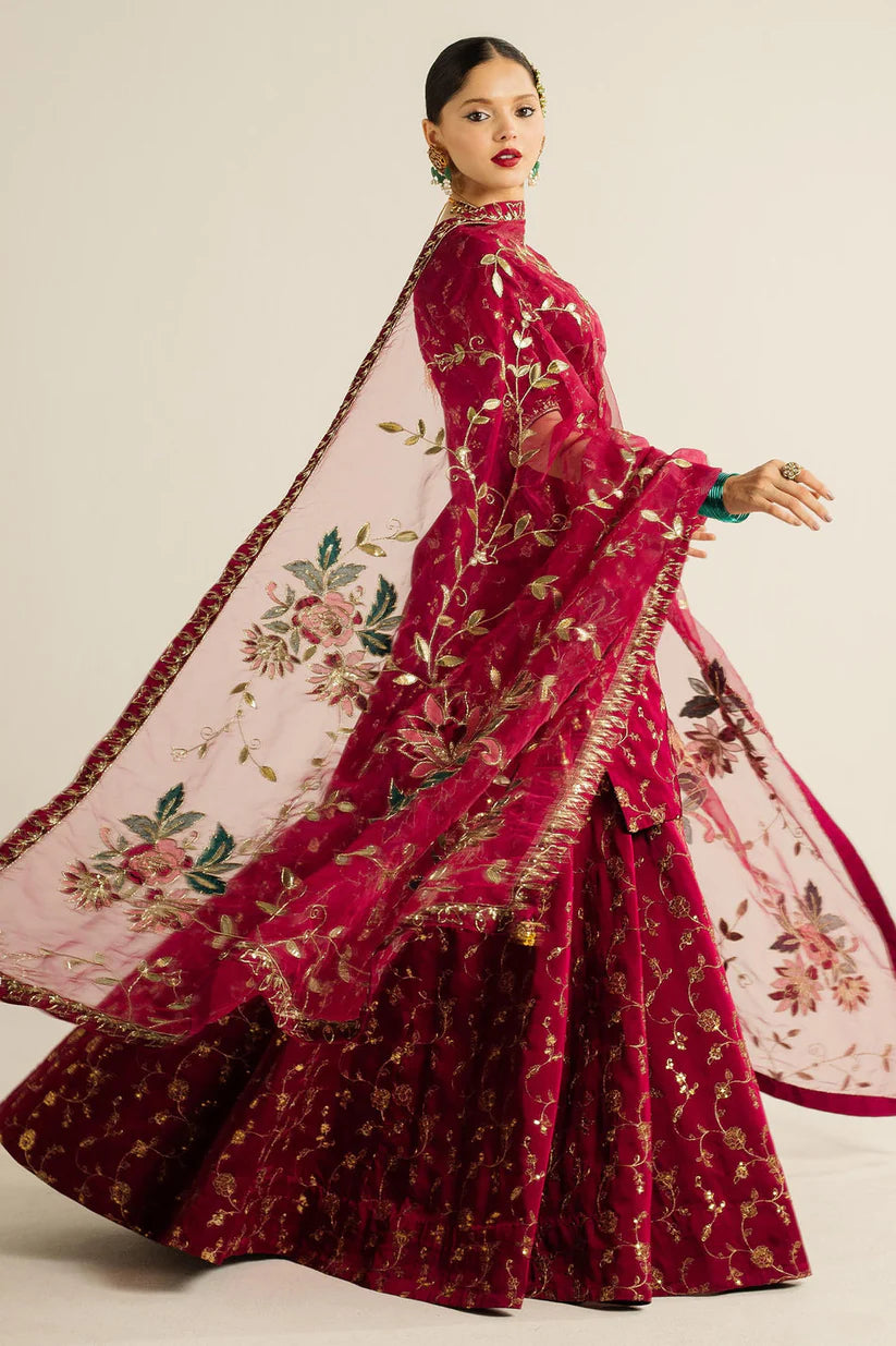 A magenta shirt and lehenga graced by full front and back embroidery. Embellished with zardozi it is beautifully paired with an organza dupatta with floral bunches and patchwork. The subtle shimmer of the lappa creates a timeless appeal for an authentic Zara Shahjahan aesthetics to this beautiful outfit.