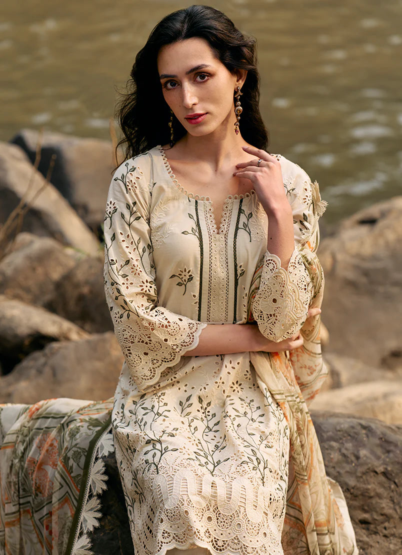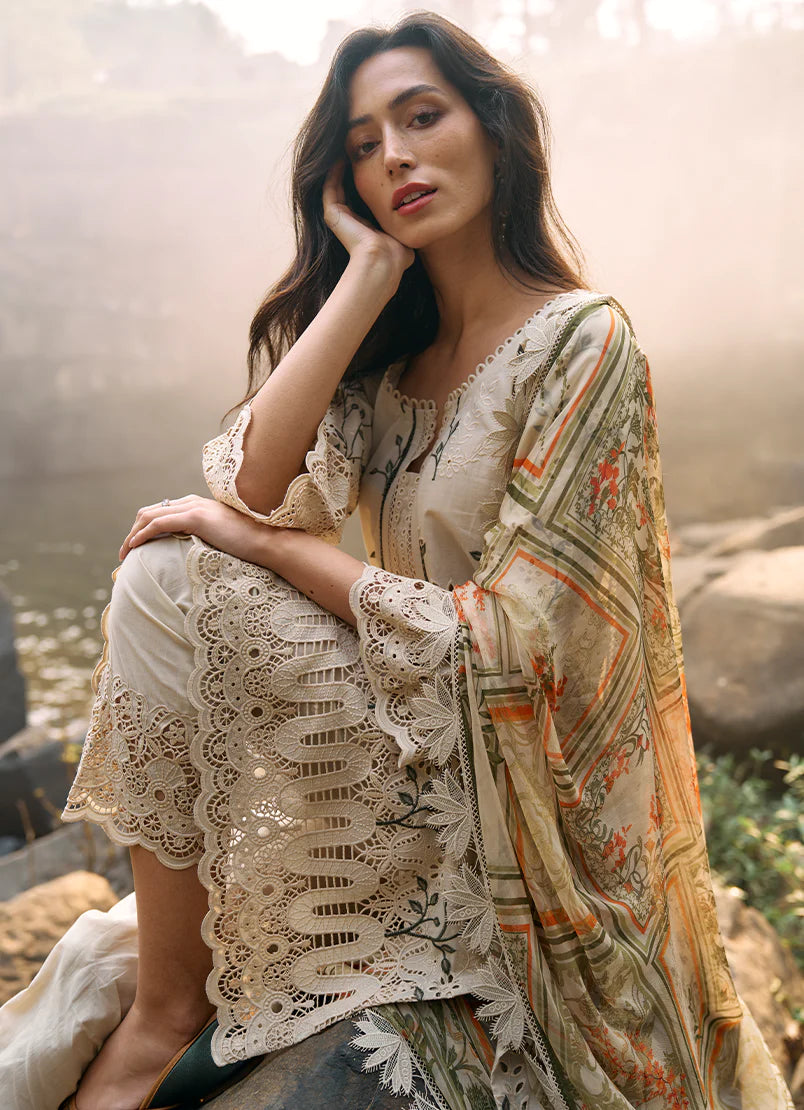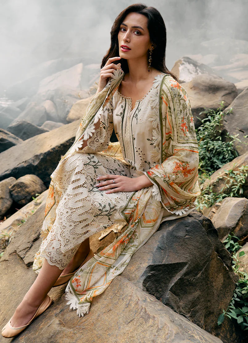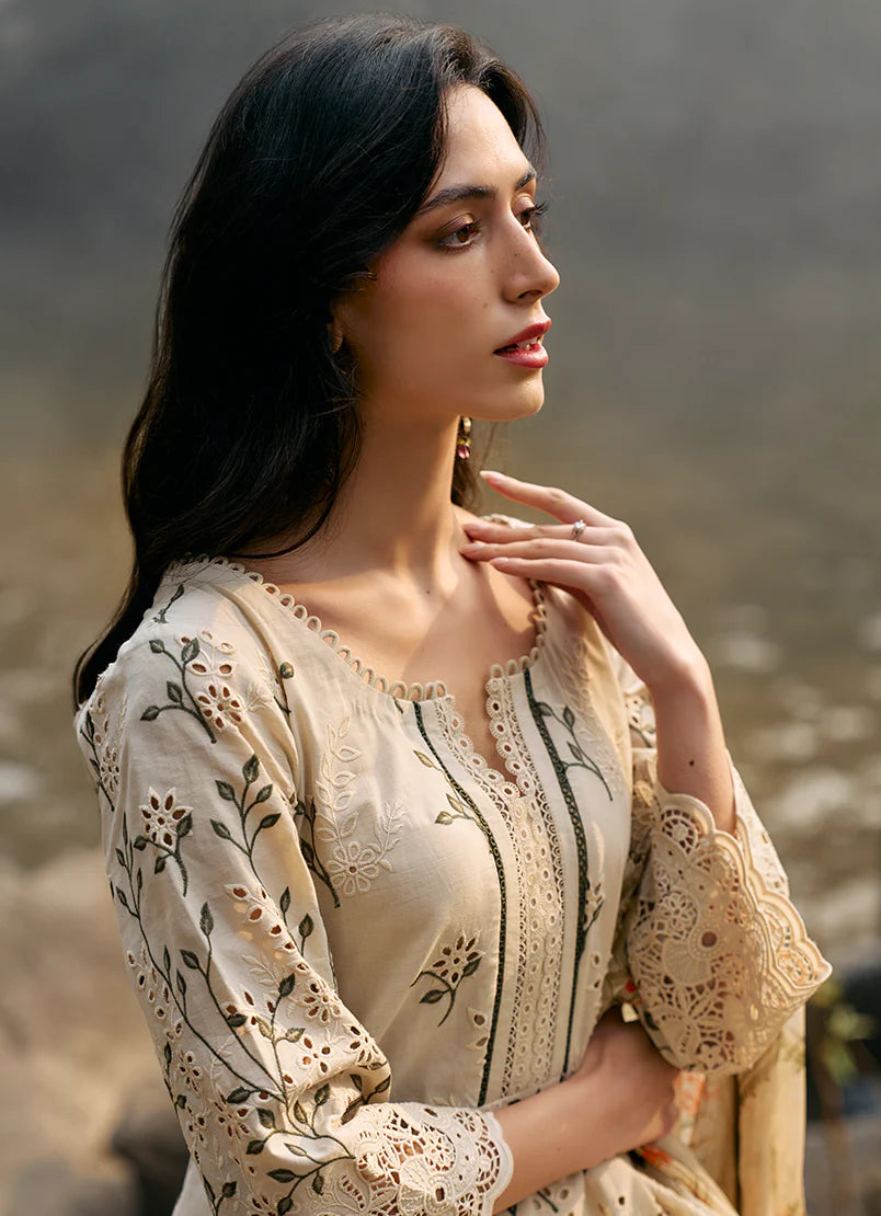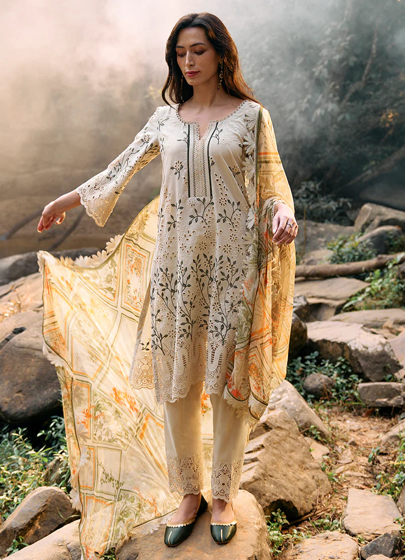 Zehrish features two tone embroidery on a Schiffli embroidered fabric complimented by scallop cut lacework on shirt hemline, sleeves and trousers.