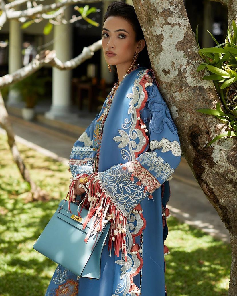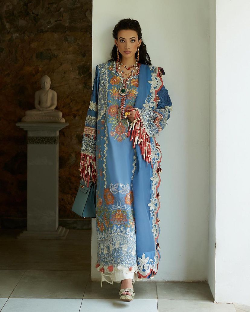 As Azure unfolds its enchanting canvas, 'Ziva' paints a mesmerizing tableau, where a riot of florets and folioles dance in sublime harmony. Élan's signature taankas, in shades of moss, scarlet, tangerine, sage, and ivory, adorn this exquisite embroidered composition. Meticulously laid schiffli details in heavenly ivory add an oomph of allure, while a light-as-air dupatta, embraced by embroidered ivory scallops, completes this creation of feminine allure, elevated textures, and luxurious accents