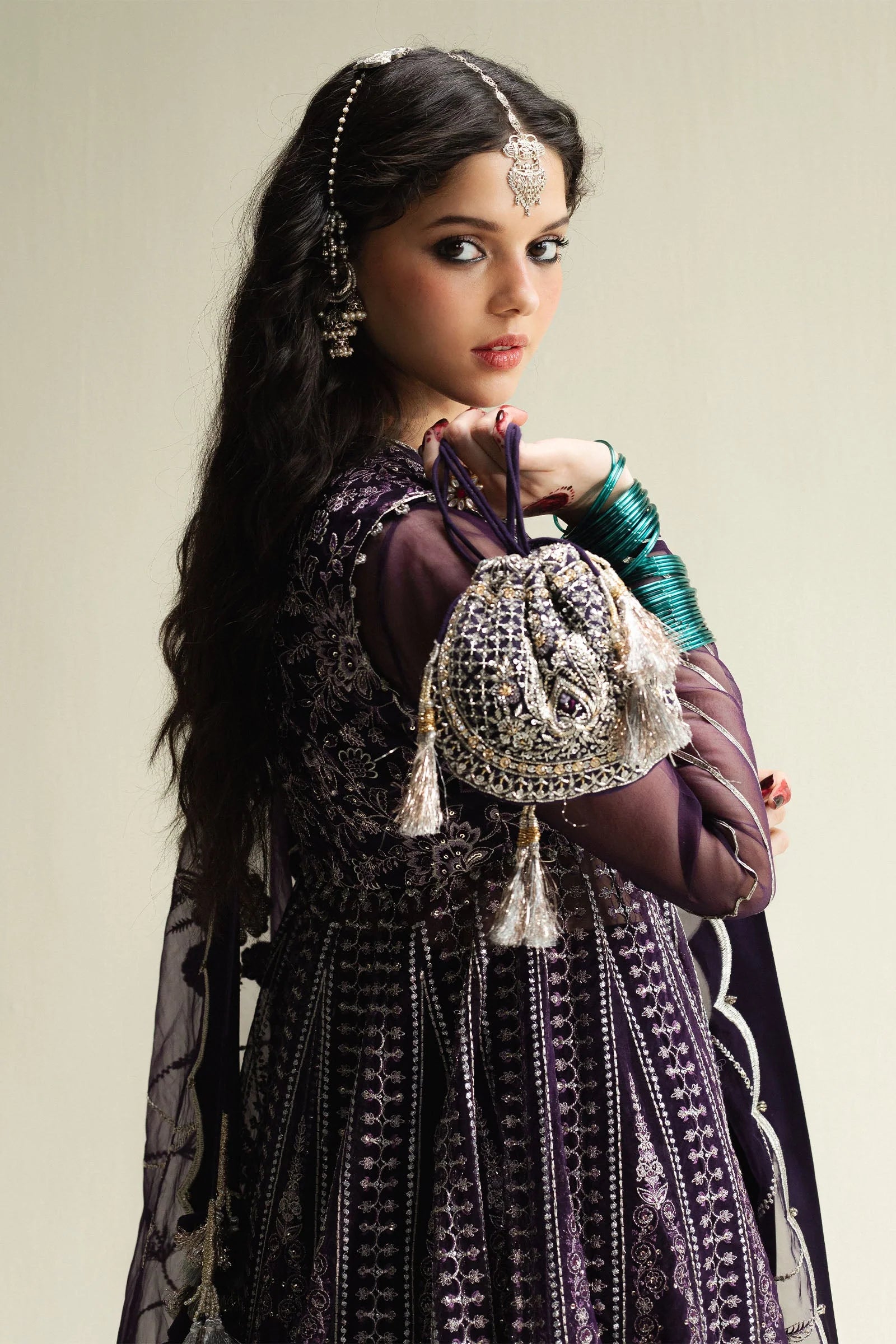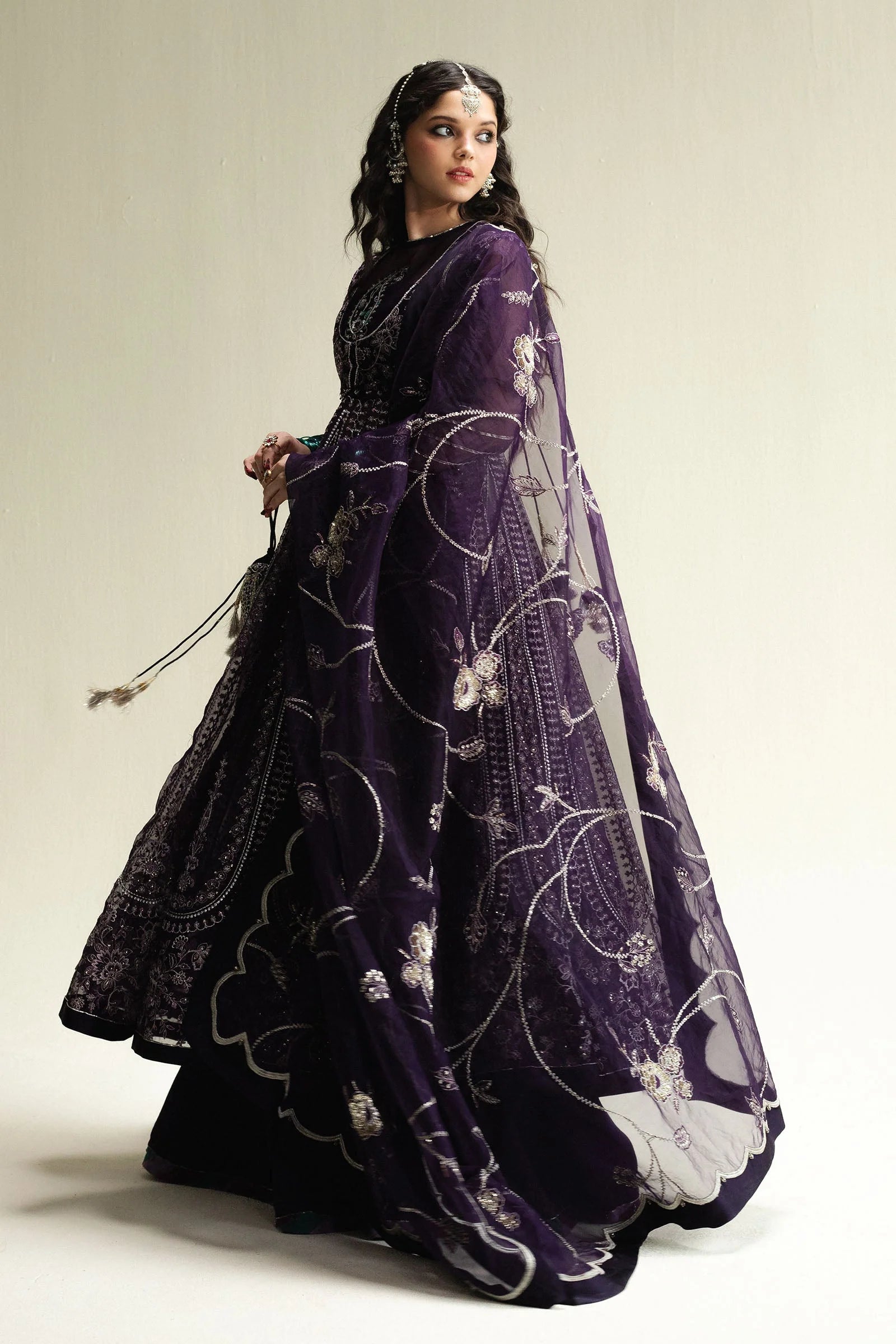 A regal purple Anarkali crafted with paneled embroidery in silver and gold tila jal. Styled with a deep-neck koti that reveals a hand-embroidered paisley motif beneath, the look carries an air of understated luxury. Paired with a Korean silk sharara, finished with a vibrant chatta pati border, this ensemble is a striking blend of tradition and modern elegance.
