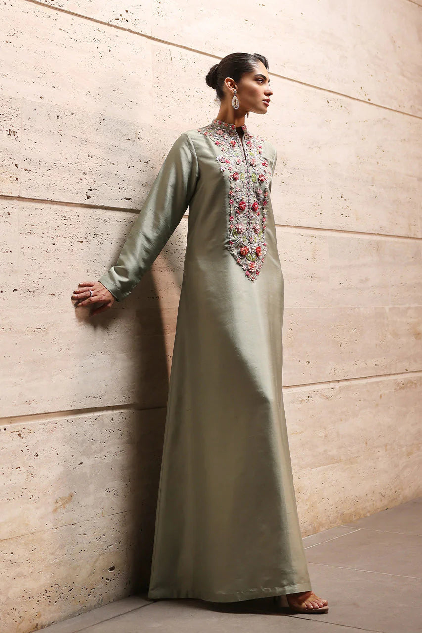 The kaftan’s flared silhouette shines with vibrant embroidered florals blooming along the neckline, shimmering softly with hand-adorned sequins, beads, crystals, and silver zardozi. The sage khaddi silk shella, adorned with handmade tassels on the pallus, offers texture and a gentle echo of the kaftan’s palette, completing a composition that feels effortless yet refined.