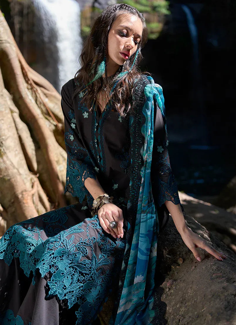 This unstitched pure cotton lawn shirt is rendered in a deep black base, highlighted with contrasting teal floral and vine-inspired motifs that create a striking, all-over fabric pattern. The design is anchored with bold ornamental borders along the edges, adding depth and visual emphasis to the composition. Paired with a pure cotton cambric trouser and a chiffon dupatta featuring complementary printed details, the ensemble delivers a strong visual presence while remaining breathable and well-suited for summer wear.