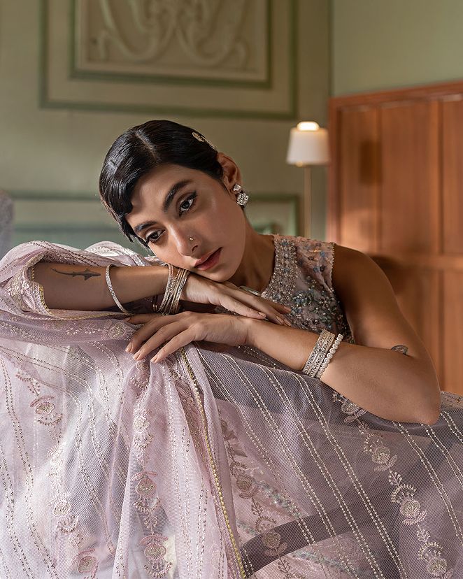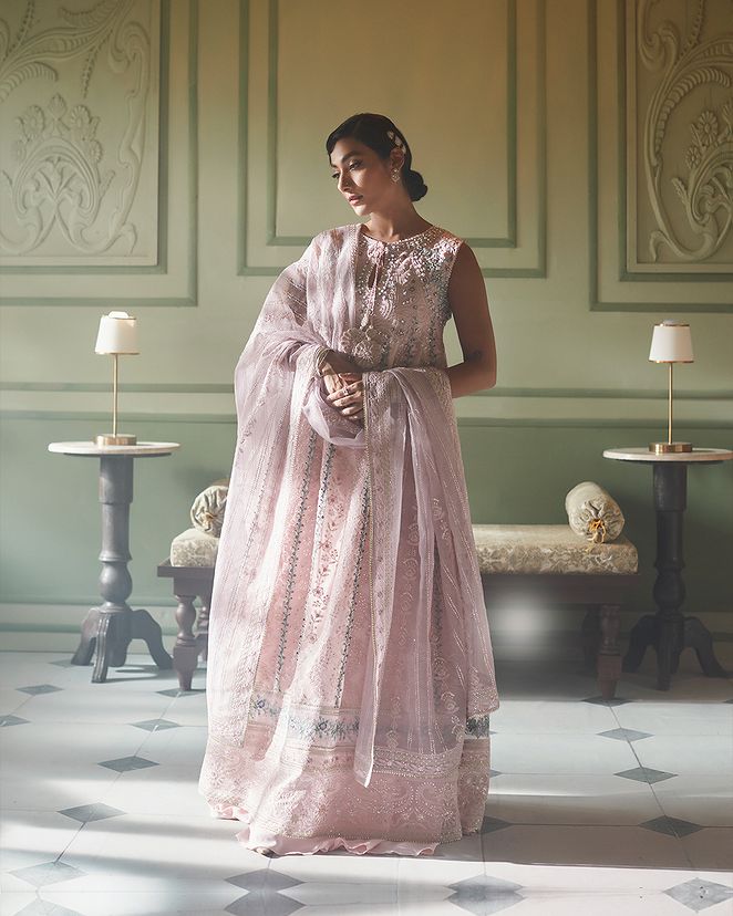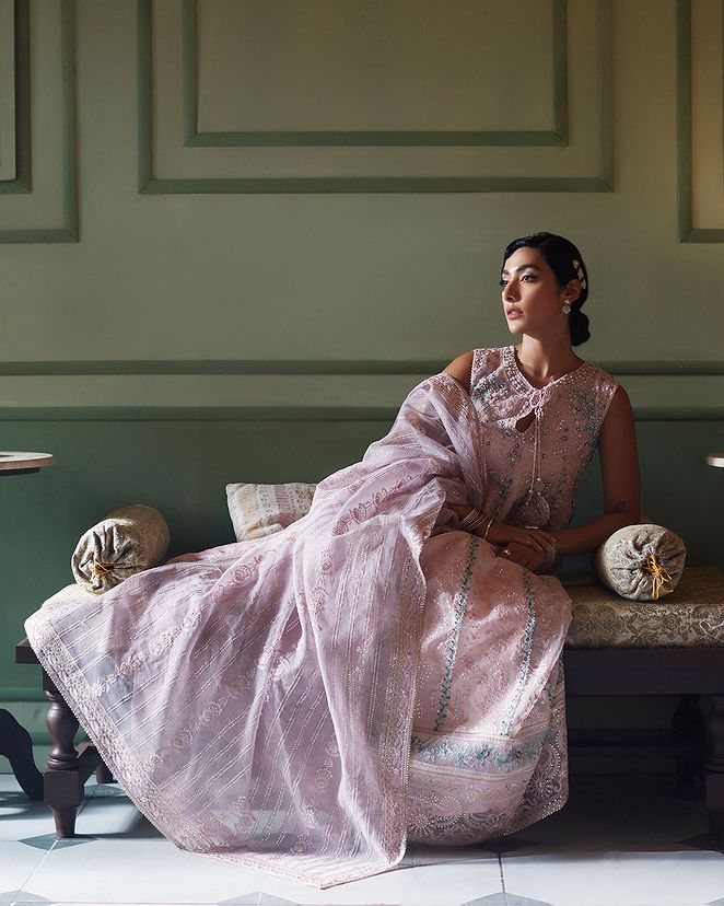 Zoya, an enchanting pink outfit designed for those who appreciate exquisite craftsmanship and timeless beauty. The center piece of this ensemble is the meticulously crafted neckline. Delicate embroidery work, adorned with sequins, graces the organza net, adding a touch of shimmering opulence to the outfit. With its embroidered sequins and hand-embellished neckline on ethereal organza net, Zoya captures the essence of luxury and sophistication.