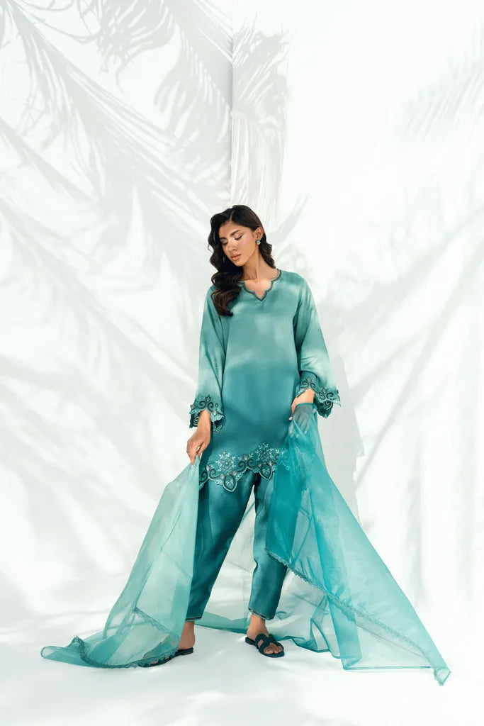 This two-tone ensemble features a short shirt and shalwar, both crafted in pure sheesha silk and detailed with intricate cutwork embroidery along the shalwar edging, as well as the hem, sleeves, and neckline of the shirt. The placement of the embroidery defines the silhouette with clarity and precision. Paired with an organza dupatta, the look is completed with a soft, balanced finish.